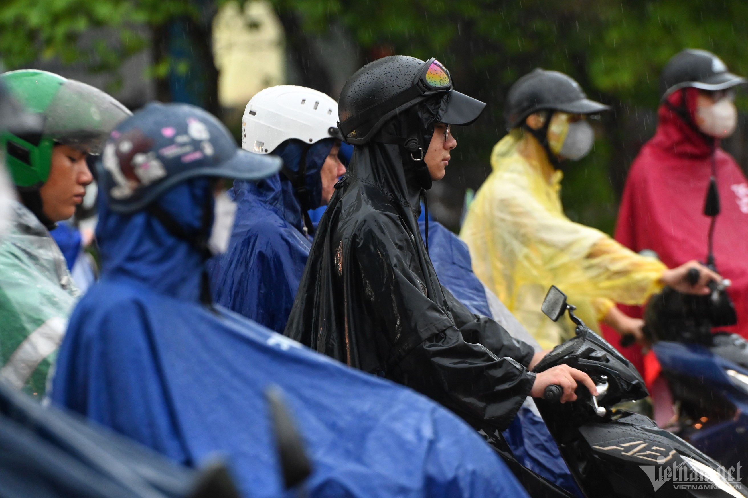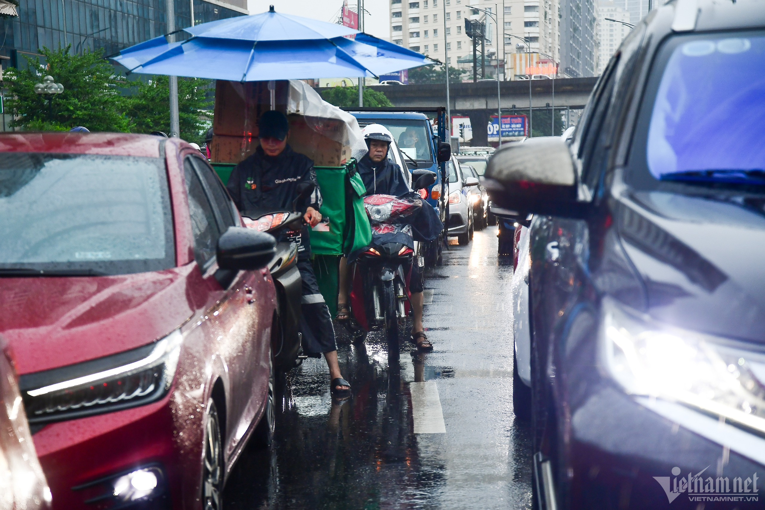 Một người vận chuyển hàng sử dụng chiếc ô rất to để che chắn. “Cứ mưa lớn là tắc đường, thời gian đi lại gấp đôi so với ngày bình thường”, ông Hướng (51 tuổi) vừa vượt lên vừa than thở.