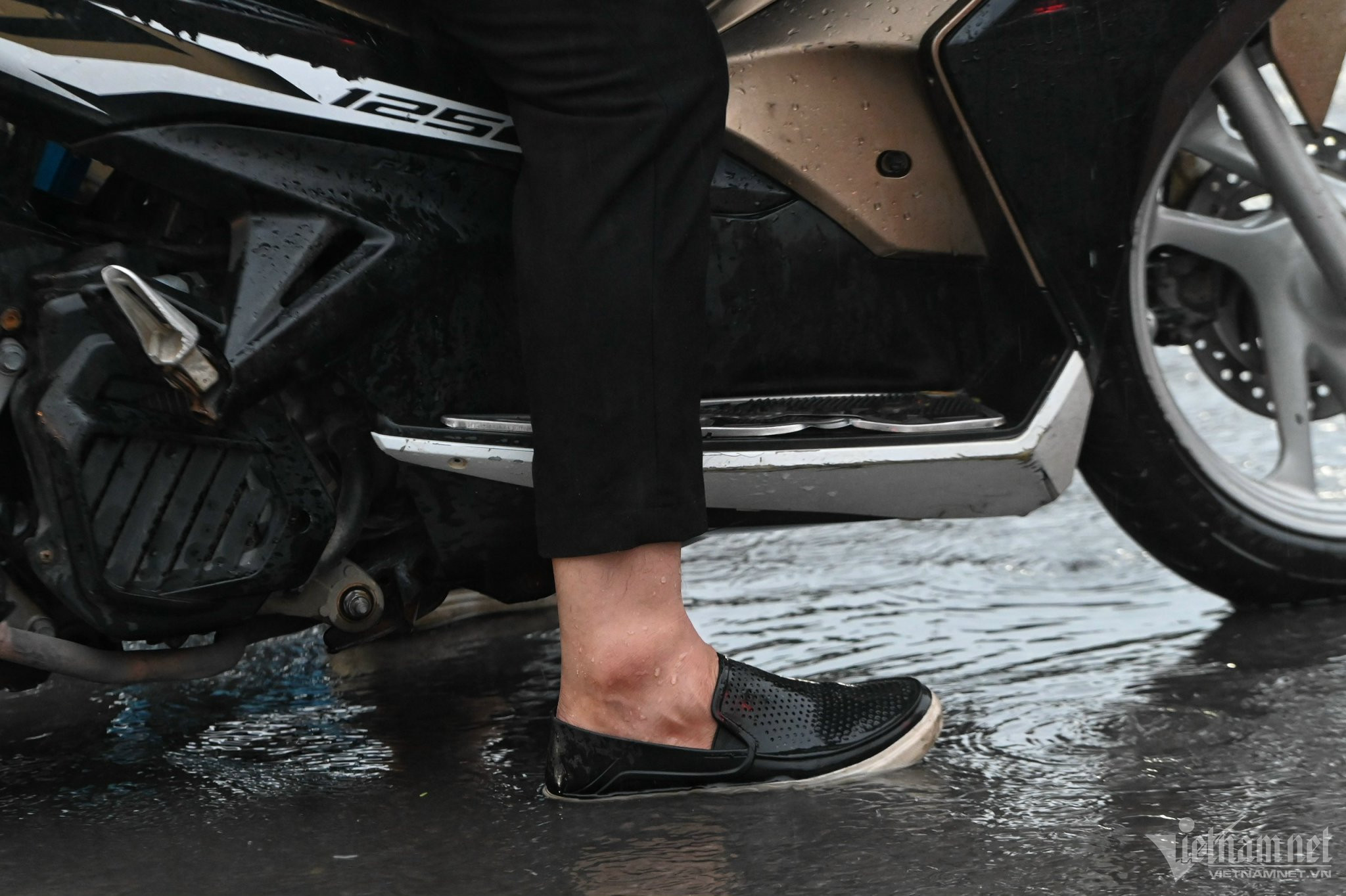 Một đoạn đường trên phố Nguyễn Chí Thanh nước không kịp thoát. Người đi xe máy dừng chờ đèn đỏ phải chịu ướt giày dép.