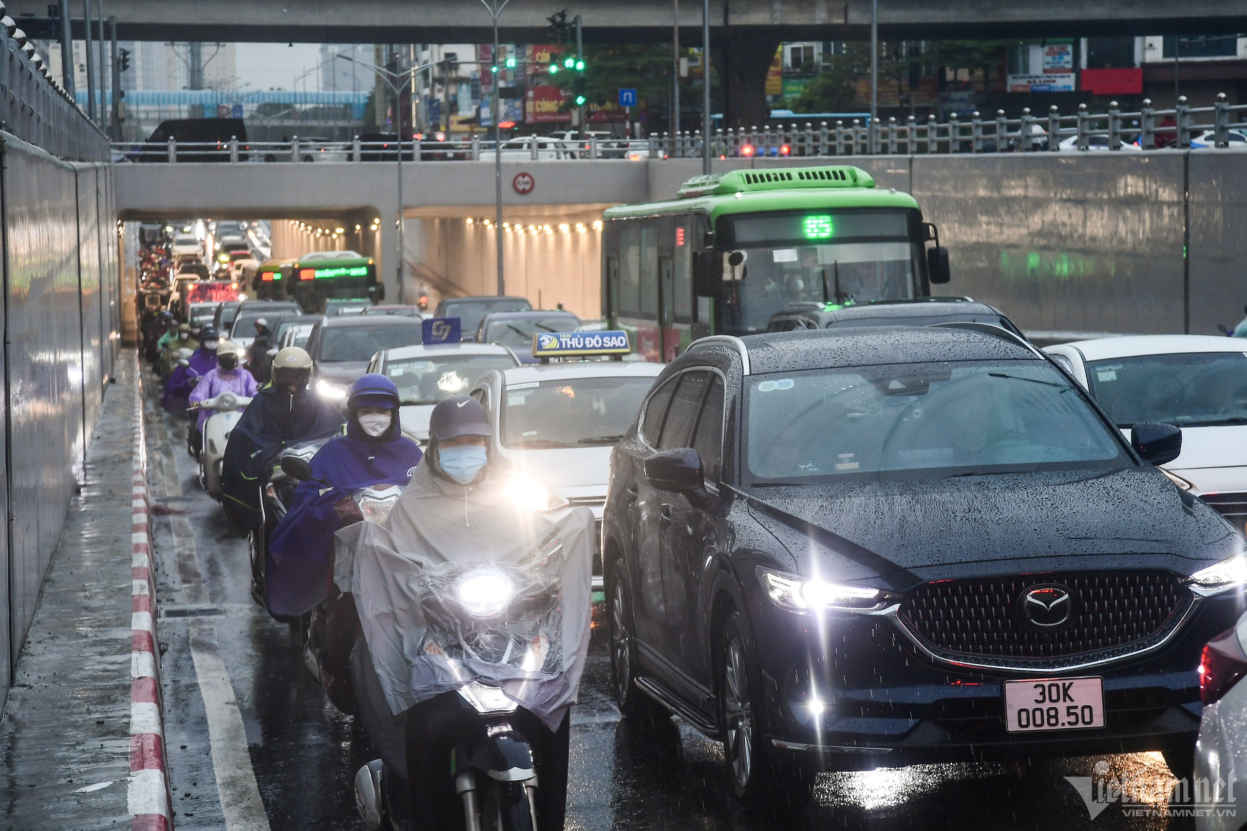 8h, tại nút giao Hầm chui Trung Hoà (quận Cầu Giấy), như thường lệ ở hướng vào trung tâm, cảnh ùn tắc kéo dài cả phía trên và dưới hầm.