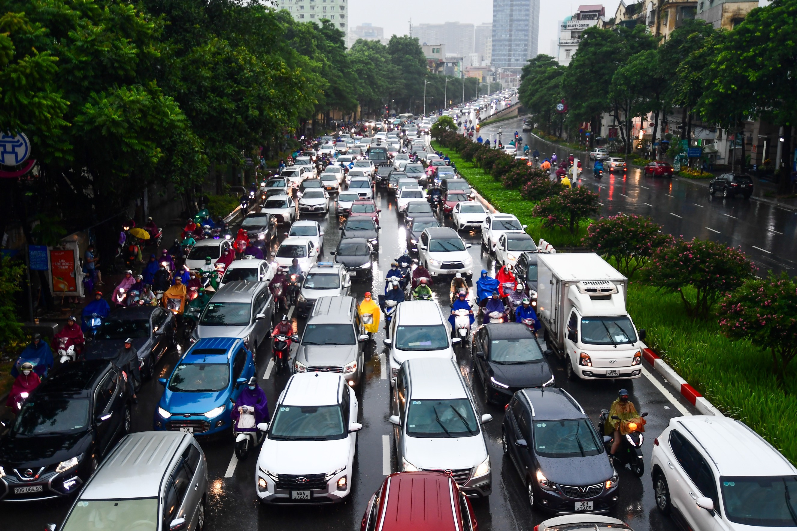 Cơn mưa trút xuống trung tâm Thủ đô đúng vào giờ đi làm khiến nhiều tuyến đường tê liệt giao thông. Hình ảnh tại phố Đào Tấn, hàng dài ô tô nhích từng chút để qua ngã tư. Lúc này các phương tiện đều phải bật đèn vì trời mù và tối.