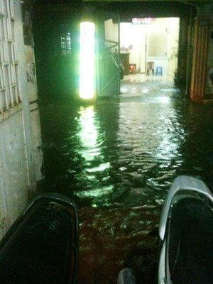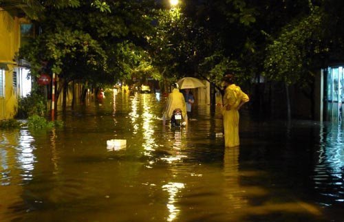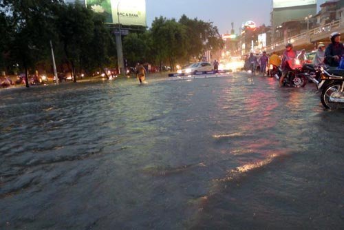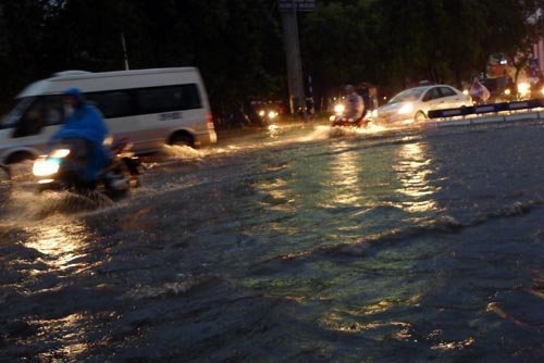 Đến khoảng gần 5g chiều, trận mưa lớn bắt đầu trút xuống. Trận mưa xối xả kéo dài đến gần 7 giờ tối khiến nhiều tuyến phố như Tây Sơn, Núi Trúc, Nguyễn Khuyến, Phan Bội Châu, Lý Thường Kiệt, Thái Thịnh, … ngập úng. Đặc biệt ở phố Núi Trúc, chị Lê – người đi làm về qua phố này – cho biết nước ngập lên tới tận đầu gối khiến rất nhiều xe máy bị chết máy.