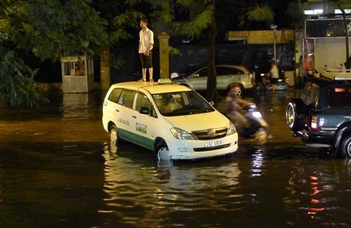 Tương tự, tại phố Nguyễn Khuyễn có những điểm nước ngập sâu quá bánh xe ôtô như đoạn trước cổng trường THCS Lý Thường Kiệt. Giao thông khu vực này tắc nghẽn, hỗn loạn vì các phố xung quanh đều bị “phong tỏa” do cũng bị ngập.