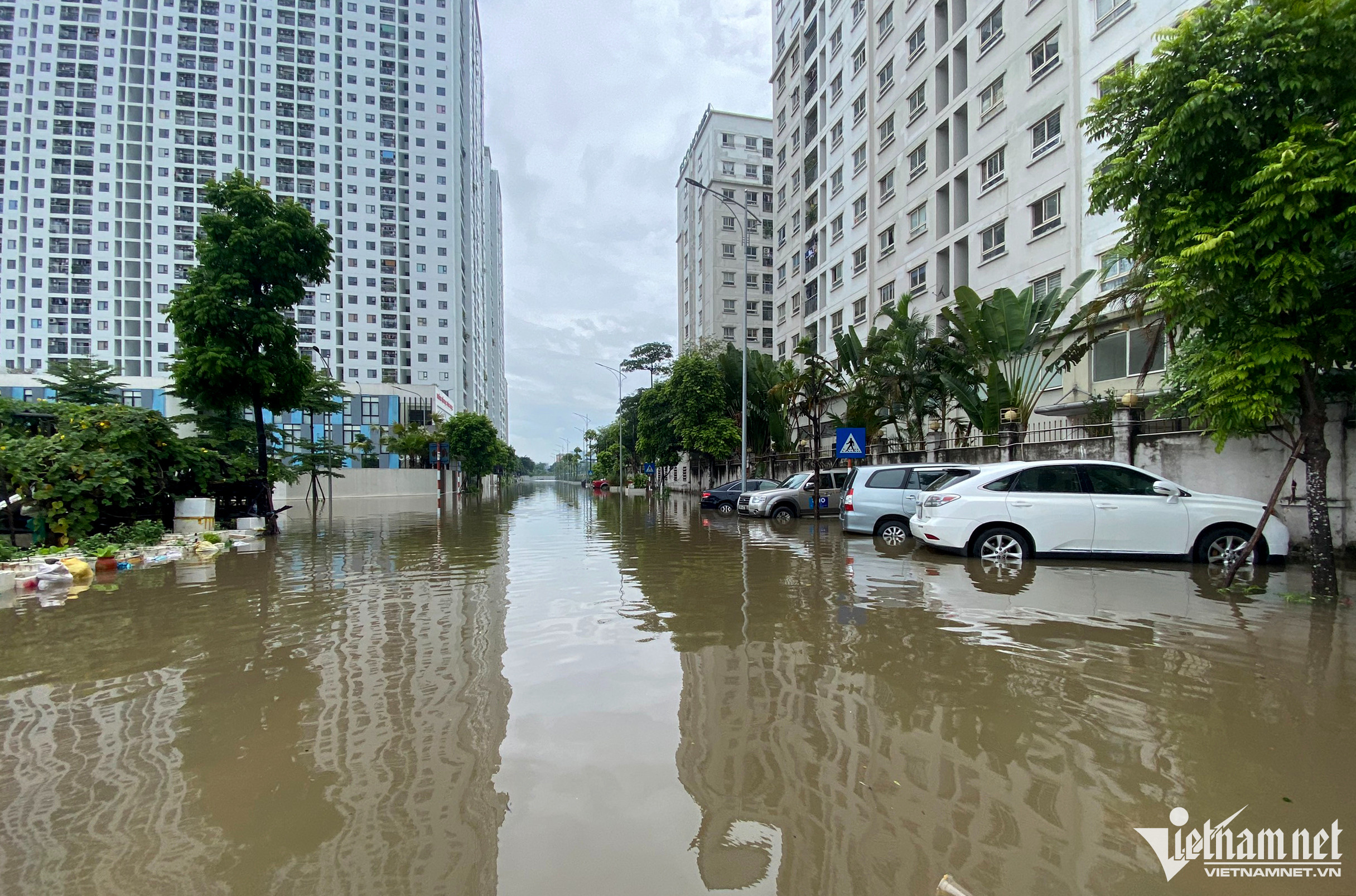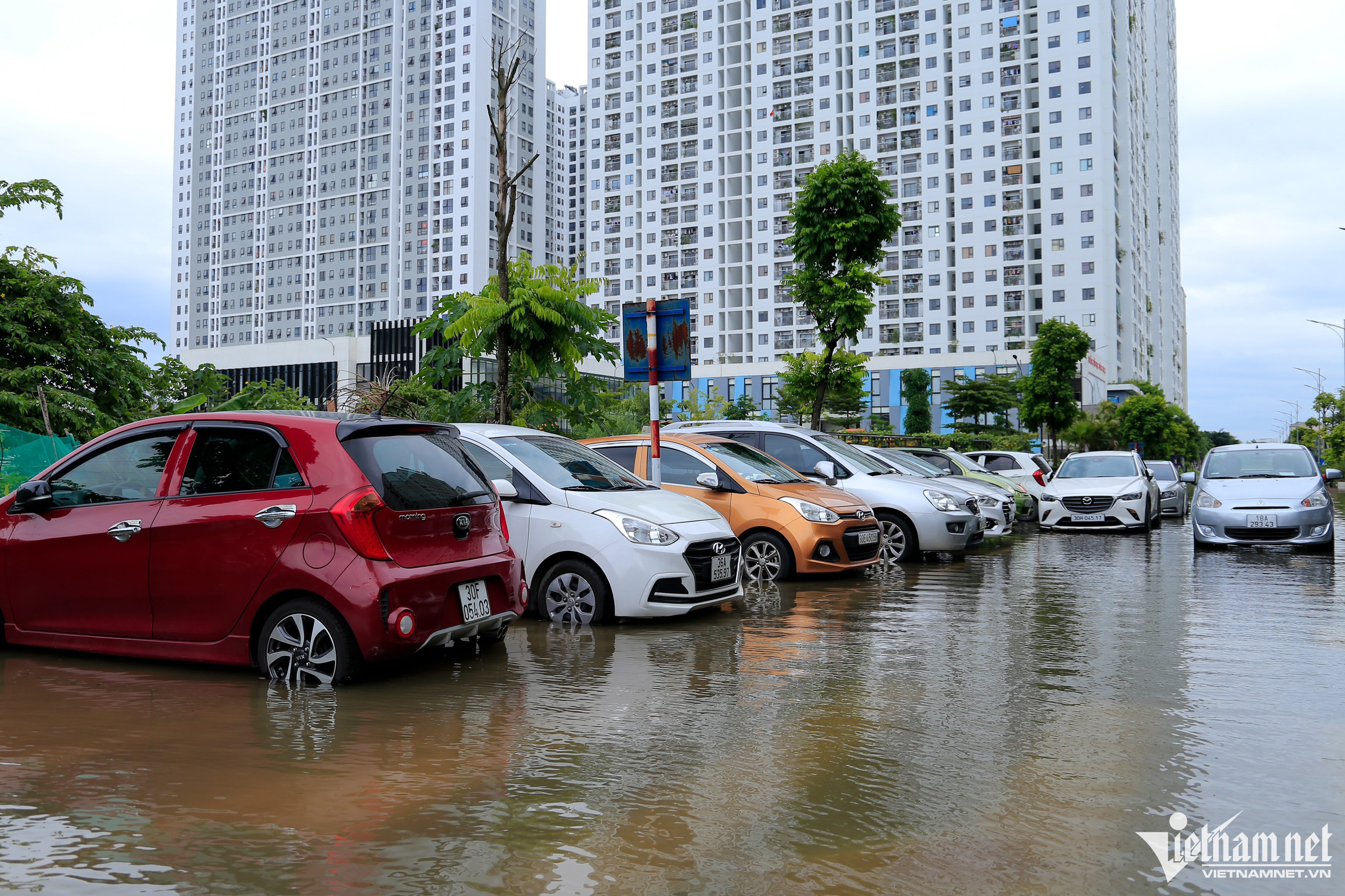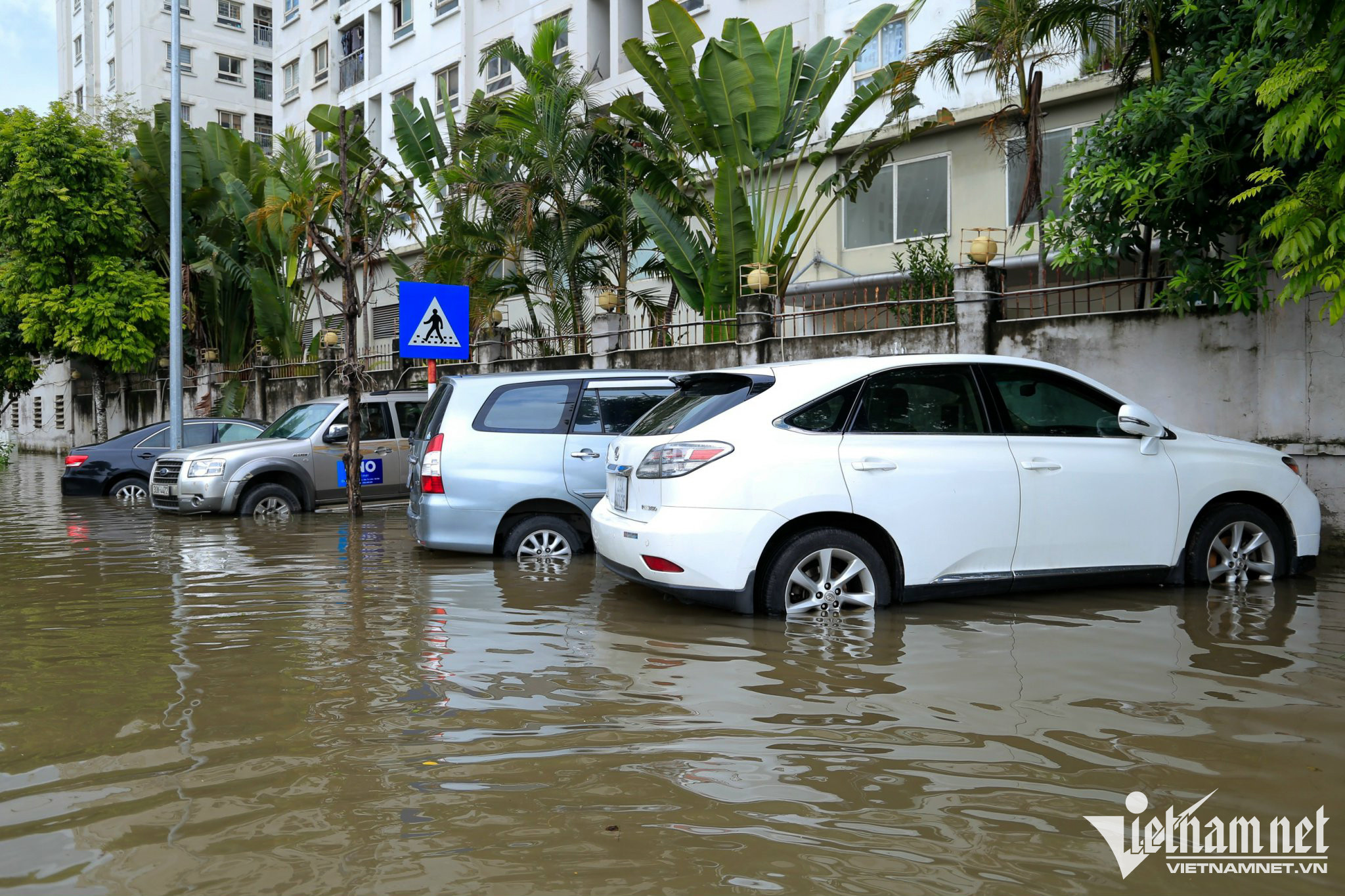 Trận mưa từ đầu giờ sáng khiến khuôn viên chung cư Ecohome 1 và 3 (quận Bắc Từ Liêm, Hà Nội) bị ngập sâu. Đến 14h chiều, nhiều ôtô vẫn nằm bất động giữa mênh mông nước.