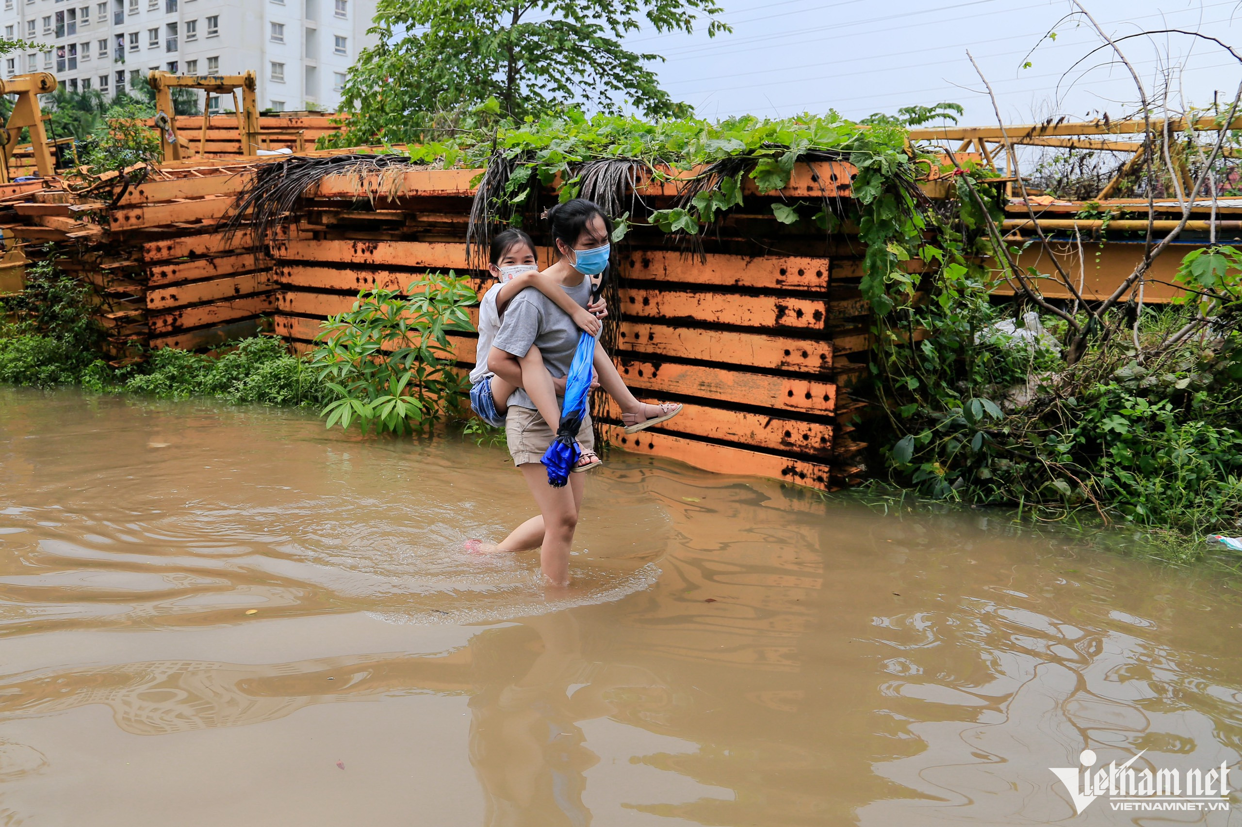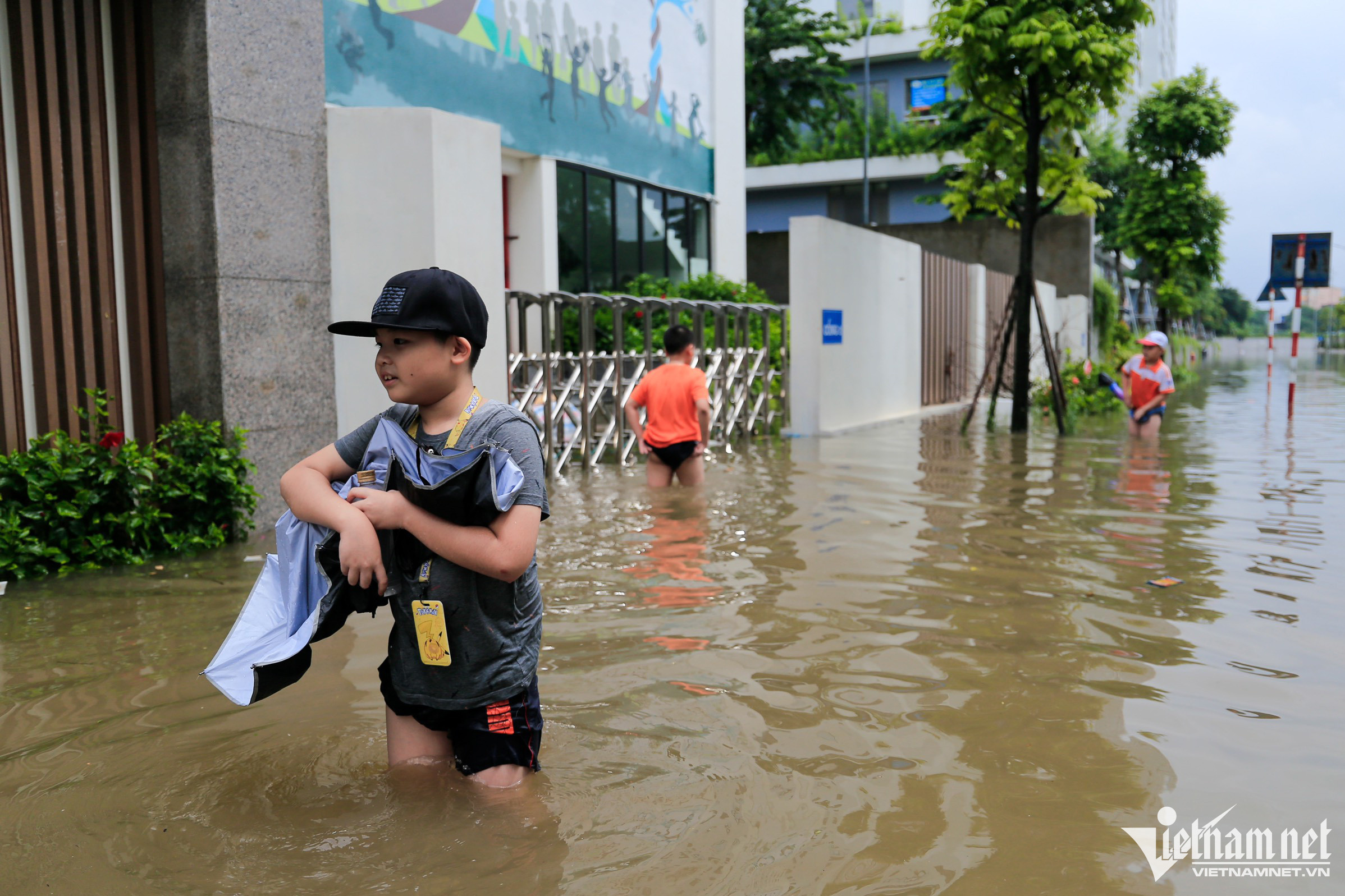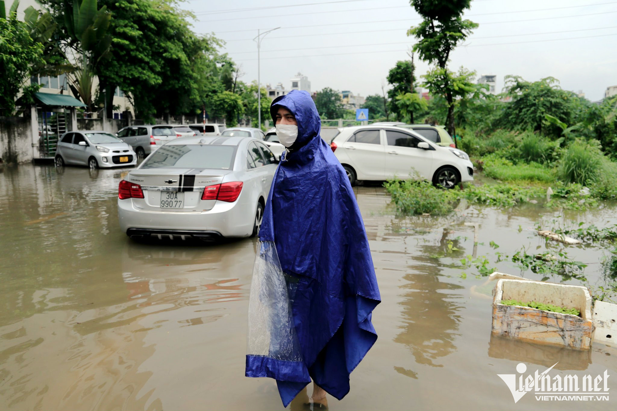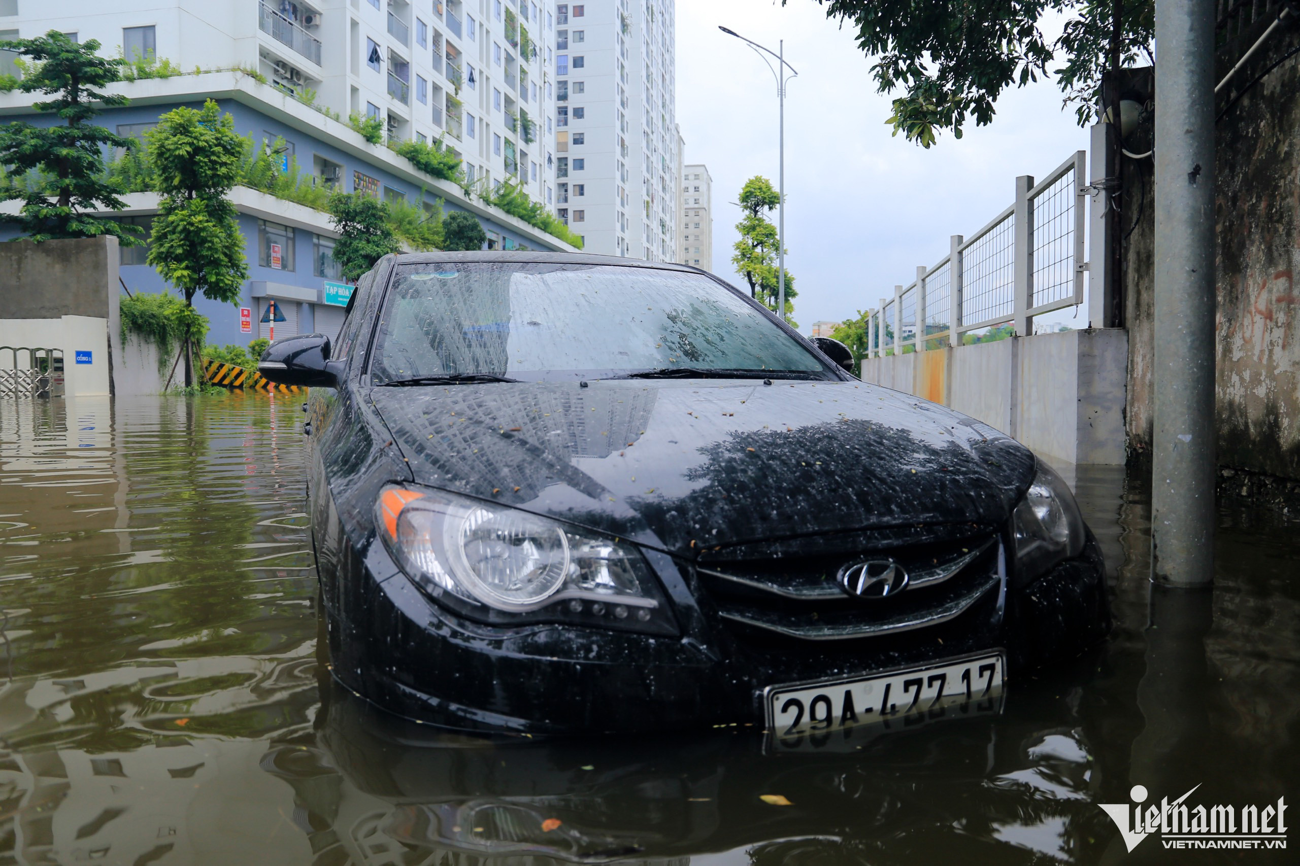 Trận mưa từ sáng 11/8 tuy không quá lớn nhưng vẫn gây ngập một số nơi. Trong ảnh là khu chung cư Ecohome (quận Bắc Từ Liêm, Hà Nội)Tại các tòa Ecohome 1 và 3 lúc 13h, nước vẫn ngập cao khoảng 40-50cm, khiến ôtô của nhiều cư dân nằm bất động, muốn đánh đi nơi khác để tránh cũng không thể.Được biết, vào buổi sáng nước ngập sâu hơn như thế này.Chiếc Hyundai này buổi sáng bị ngập sâu hơn hiện tại. Người dân cho biết lần nào mưa nước cũng rút khá chậm.Anh Đoàn Văn Minh (cư dân Ecohome 1) cho biết tình trạng này xảy ra thường xuyên. “Cứ mưa lớn là ngập, đợt trước ngập khoảng 10 xe, dân đã phải nhờ cứu hộ kéo đi, đợt này thì ít hơn. Tôi may mắn do xem dự báo thời tiết hôm nay có mưa to đã tranh thủ kéo xe lên chỗ cao từ trước", anh nói.Trường tiểu học Đông Ngạc (phường Đông Ngạc, quận Bắc Từ Liêm) có vị trí nước ngập gần 1m, việc đi học của các em gặp nhiều khó khăn. Thông thường, nếu mưa to và nước ngập quá sâu, nhà trường cho học sinh ở nhà để đảm bảo an toàn.Một số học sinh tìm đường về nhà nhưng do nước ngập sâu tỏ ra lo sợ. Có em đành quay trở lại trường đợi bố mẹ đến đón. Chị Hà bì bõm cõng con trên lưng để về nhà. “Cứ mưa ngập là vất vả. Tôi thấy lo lắng và không yên tâm khi để con đi học một mình như thế này”, chị than phiền.Tại lối xuống hầm dành cho học sinh trường tiểu học Đông Ngạc, hôm nay các bao tải được chất để ngăn nước tràn vào.