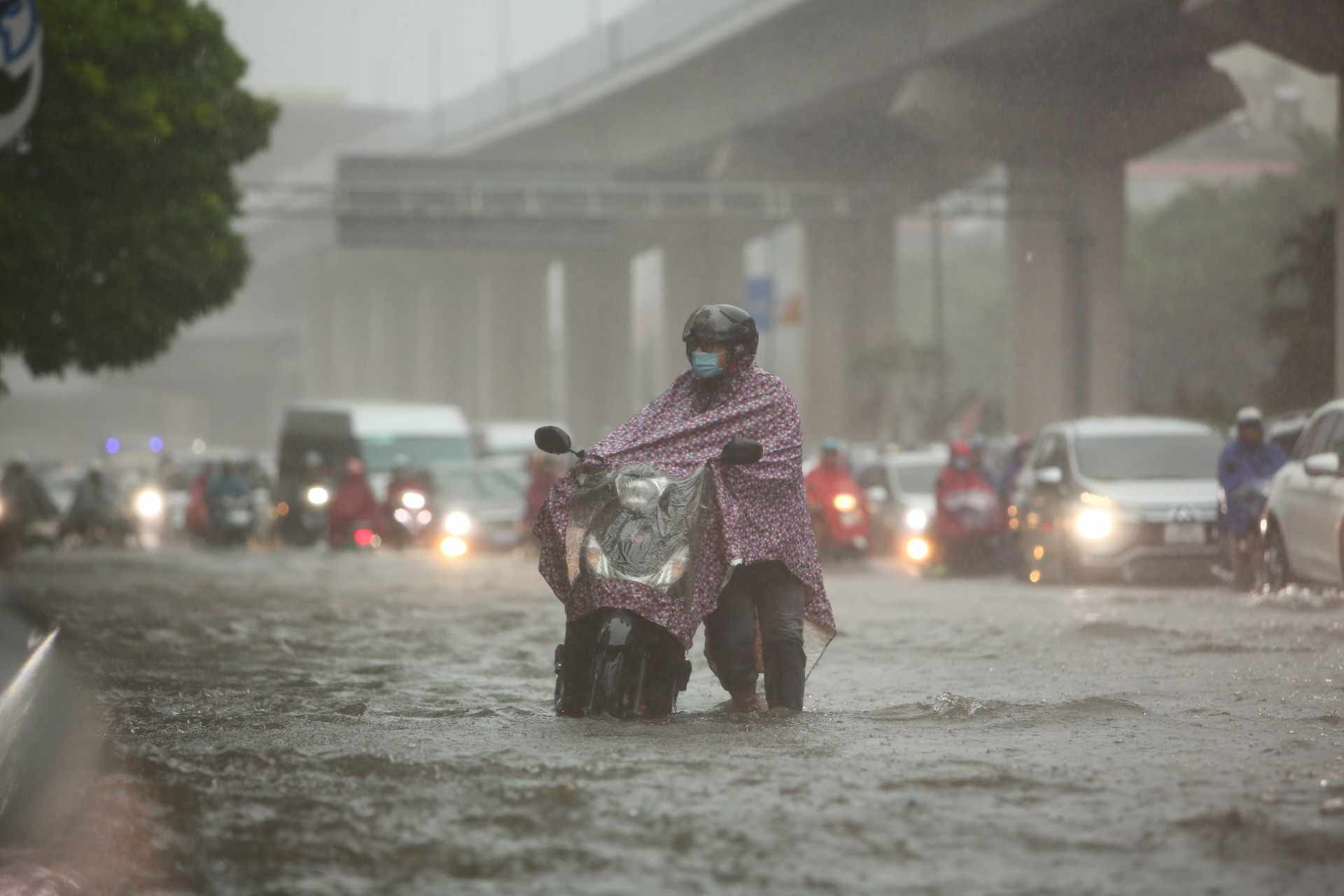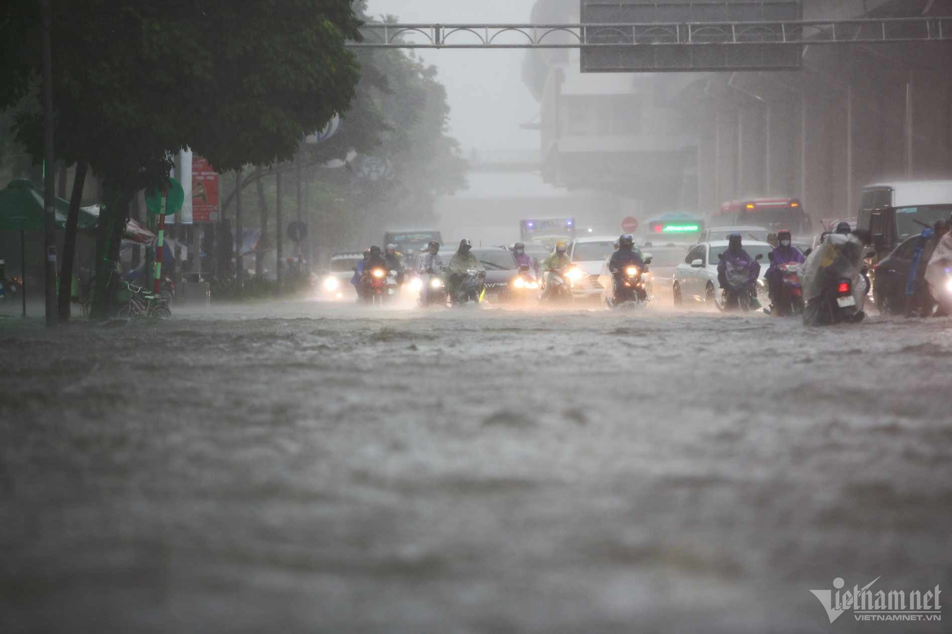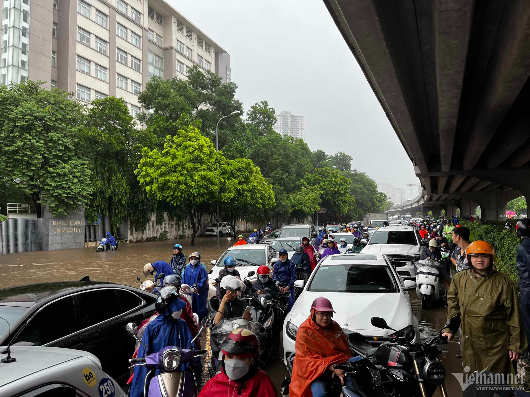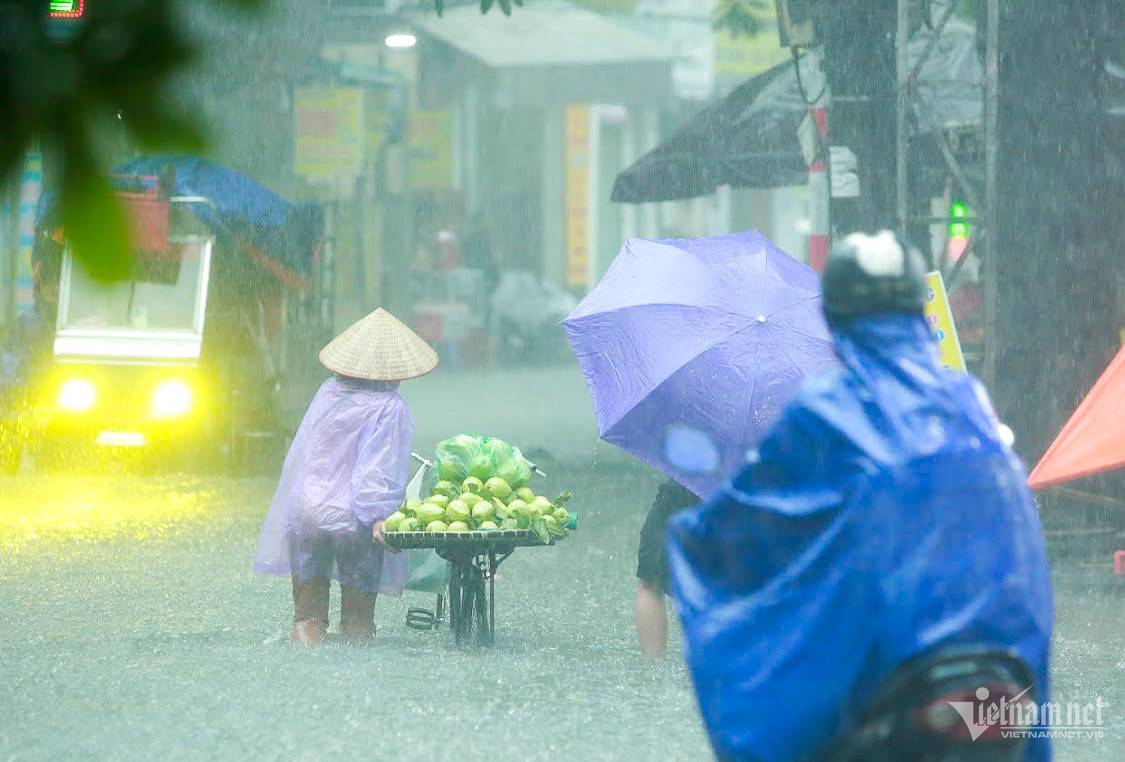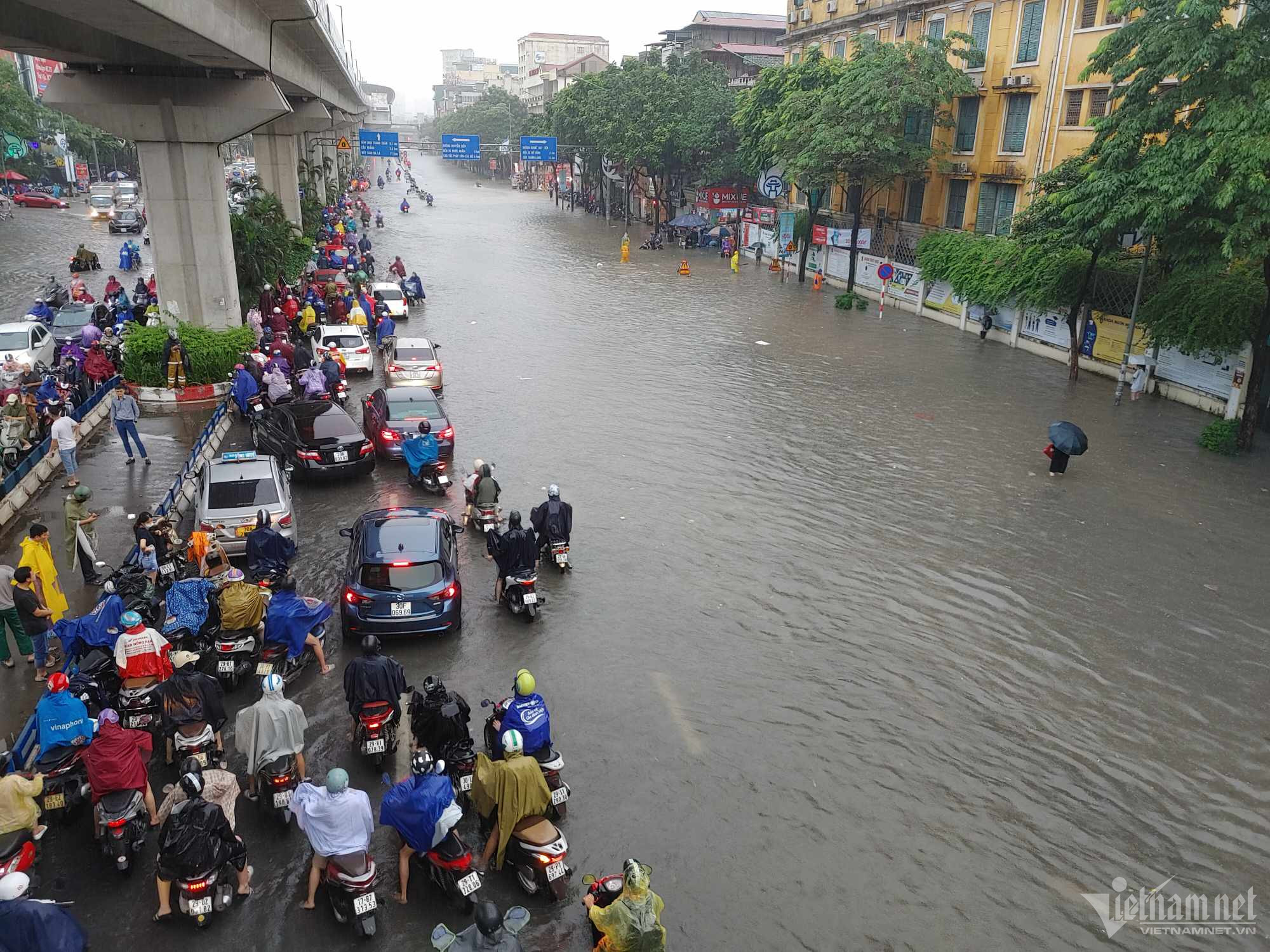 Đến hơn 10h, đường Nguyễn Trãi đoạn qua Trường Đại học Khoa học và xã hội nhân văn vẫn ngập sâu. Mức ngập sâu nhất tại đây đến 0,2m khiến phương tiện di chuyển khó khăn.Nhiều người đã dừng lại không tiếp tục di chuyển qua đoạn ngập để đảm bảo an toànMột số khác đi xe máy ngược chiều khiến tình hình giao thông hỗn loạnĐường Nguyễn Xiển ngập sâu, phương tiện không thể đi lạiNhiều tuyến phố, cửa ngõ Thủ đô như Tố Hữu, Trần Duy Hưng, Đại lộ Thăng Long, Lê Quang Đạo... đều "chìm" trong nước. Giao thông tê liệt, ùn tắc kéo dài, các phương tiện chỉ có thể "chôn chân" tại chỗ.Trên đường Lê Quang Đạo, nước ngập sâu khoảng 50cm khiến các phương tiện khó di chuyển qua.Xe máy phải dắt qua các điểm ngập.Đường Thiên Hiền (Mỹ Đình) cũng ngập sâu, khiến nhiều xe chết máy.Nhiều tuyến phố nước ngập quá nửa bánh xe.Đường Trần Duy Hưng cũng rơi vào tình trạng tương tự.Nhiều xe máy "chết đuối" sau khi bơi qua "biển" nước.Tuyến đường Tố Hữu ngập sâuGhi nhận tại Đại lộ Thăng Long Nước ngập gần lút bánh xe.Người dân tát nước ra khỏi nhà.