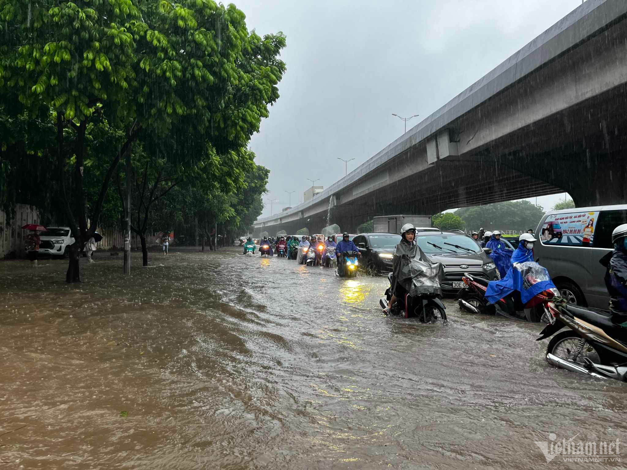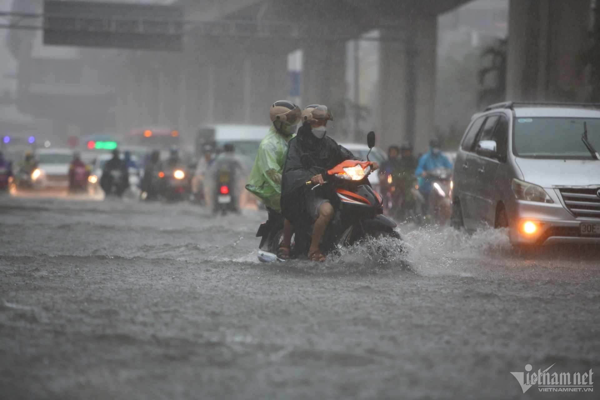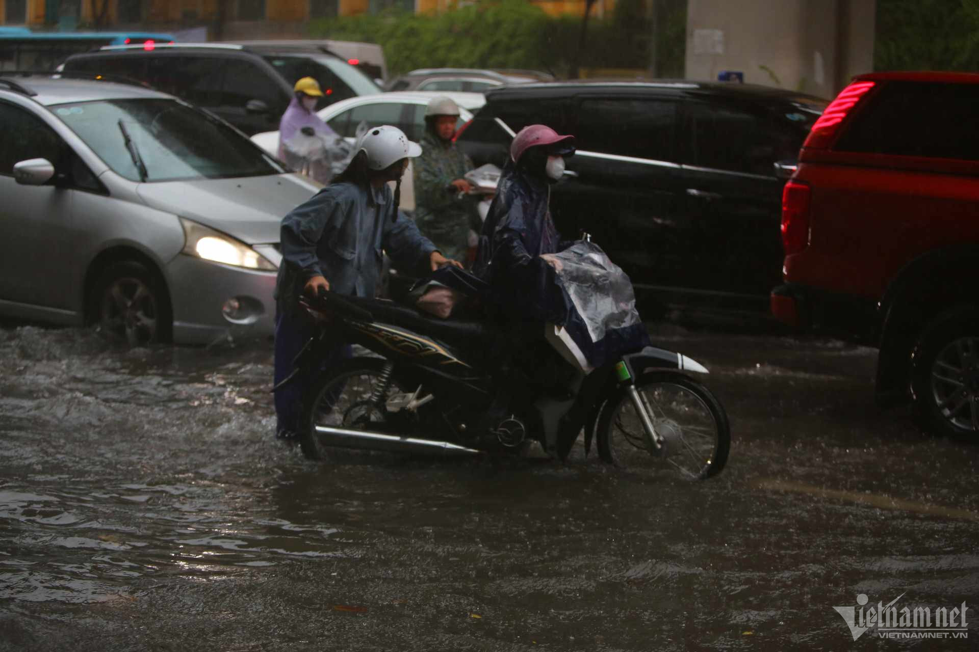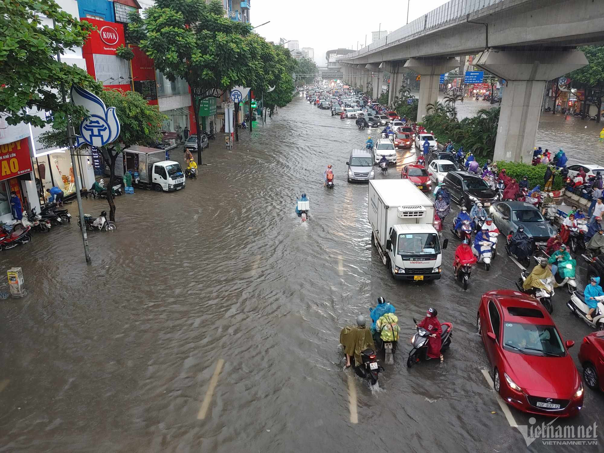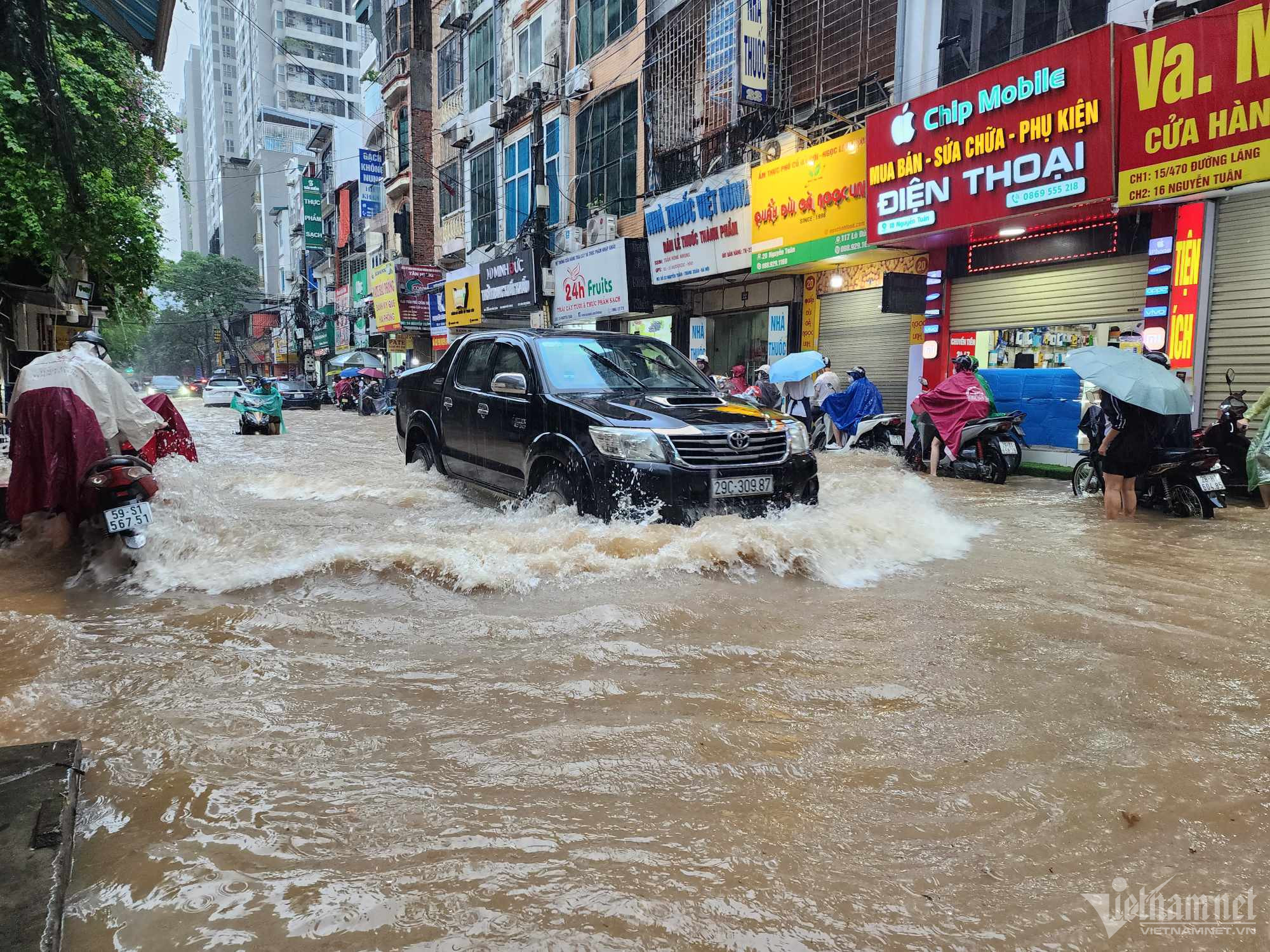 Đến hơn 10h, đường Nguyễn Trãi đoạn qua Trường Đại học Khoa học và xã hội nhân văn vẫn ngập sâu. Mức ngập sâu nhất tại đây đến 0,2m khiến phương tiện di chuyển khó khăn.Nhiều người đã dừng lại không tiếp tục di chuyển qua đoạn ngập để đảm bảo an toànMột số khác đi xe máy ngược chiều khiến tình hình giao thông hỗn loạnĐường Nguyễn Xiển ngập sâu, phương tiện không thể đi lạiNhiều tuyến phố, cửa ngõ Thủ đô như Tố Hữu, Trần Duy Hưng, Đại lộ Thăng Long, Lê Quang Đạo... đều "chìm" trong nước. Giao thông tê liệt, ùn tắc kéo dài, các phương tiện chỉ có thể "chôn chân" tại chỗ.Trên đường Lê Quang Đạo, nước ngập sâu khoảng 50cm khiến các phương tiện khó di chuyển qua.Xe máy phải dắt qua các điểm ngập.Đường Thiên Hiền (Mỹ Đình) cũng ngập sâu, khiến nhiều xe chết máy.Nhiều tuyến phố nước ngập quá nửa bánh xe.Đường Trần Duy Hưng cũng rơi vào tình trạng tương tự.Nhiều xe máy "chết đuối" sau khi bơi qua "biển" nước.Tuyến đường Tố Hữu ngập sâuGhi nhận tại Đại lộ Thăng Long Nước ngập gần lút bánh xe.Người dân tát nước ra khỏi nhà.