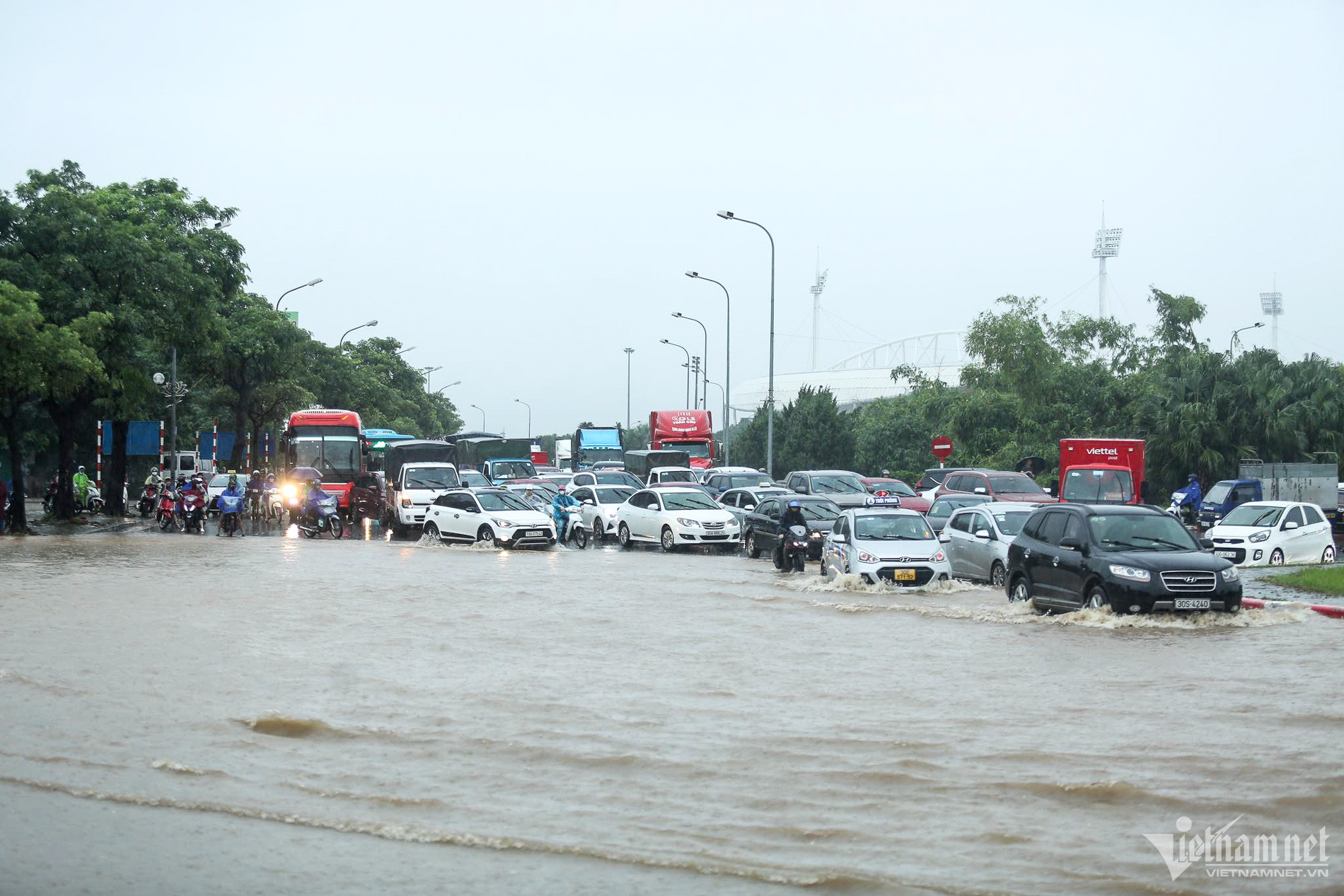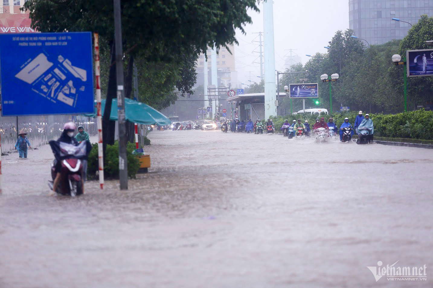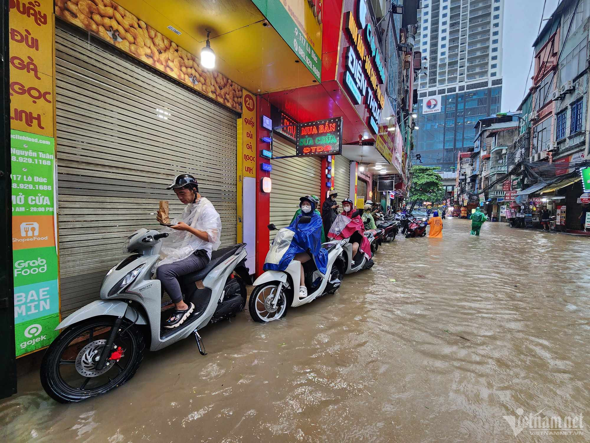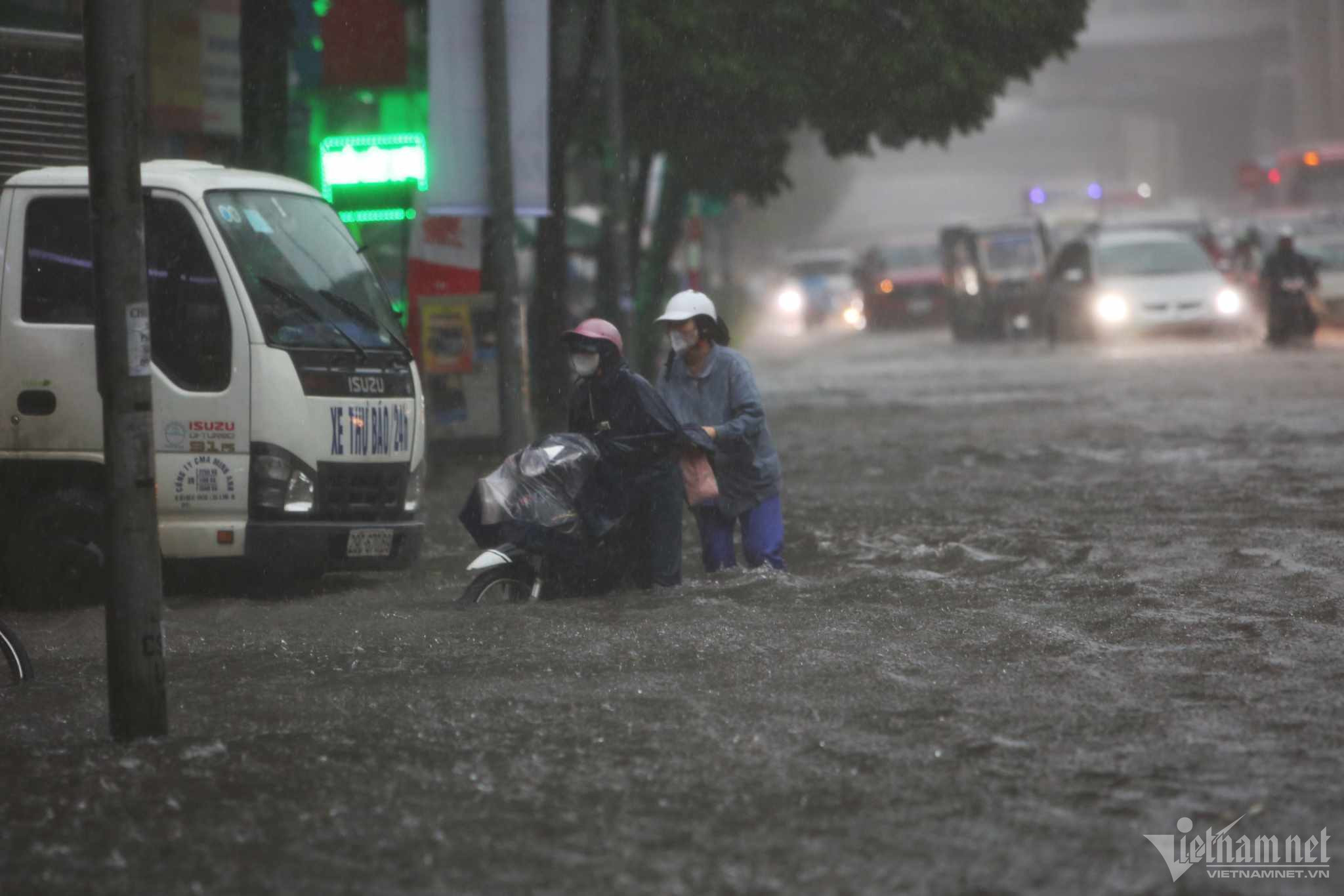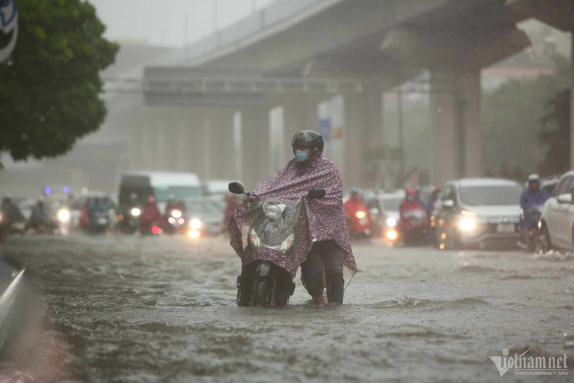 Đến hơn 10h, đường Nguyễn Trãi đoạn qua Trường Đại học Khoa học và xã hội nhân văn vẫn ngập sâu. Mức ngập sâu nhất tại đây đến 0,2m khiến phương tiện di chuyển khó khăn.Nhiều người đã dừng lại không tiếp tục di chuyển qua đoạn ngập để đảm bảo an toànMột số khác đi xe máy ngược chiều khiến tình hình giao thông hỗn loạnĐường Nguyễn Xiển ngập sâu, phương tiện không thể đi lạiNhiều tuyến phố, cửa ngõ Thủ đô như Tố Hữu, Trần Duy Hưng, Đại lộ Thăng Long, Lê Quang Đạo... đều "chìm" trong nước. Giao thông tê liệt, ùn tắc kéo dài, các phương tiện chỉ có thể "chôn chân" tại chỗ.Trên đường Lê Quang Đạo, nước ngập sâu khoảng 50cm khiến các phương tiện khó di chuyển qua.Xe máy phải dắt qua các điểm ngập.Đường Thiên Hiền (Mỹ Đình) cũng ngập sâu, khiến nhiều xe chết máy.Nhiều tuyến phố nước ngập quá nửa bánh xe.Đường Trần Duy Hưng cũng rơi vào tình trạng tương tự.Nhiều xe máy "chết đuối" sau khi bơi qua "biển" nước.Tuyến đường Tố Hữu ngập sâuGhi nhận tại Đại lộ Thăng Long Nước ngập gần lút bánh xe.Người dân tát nước ra khỏi nhà.