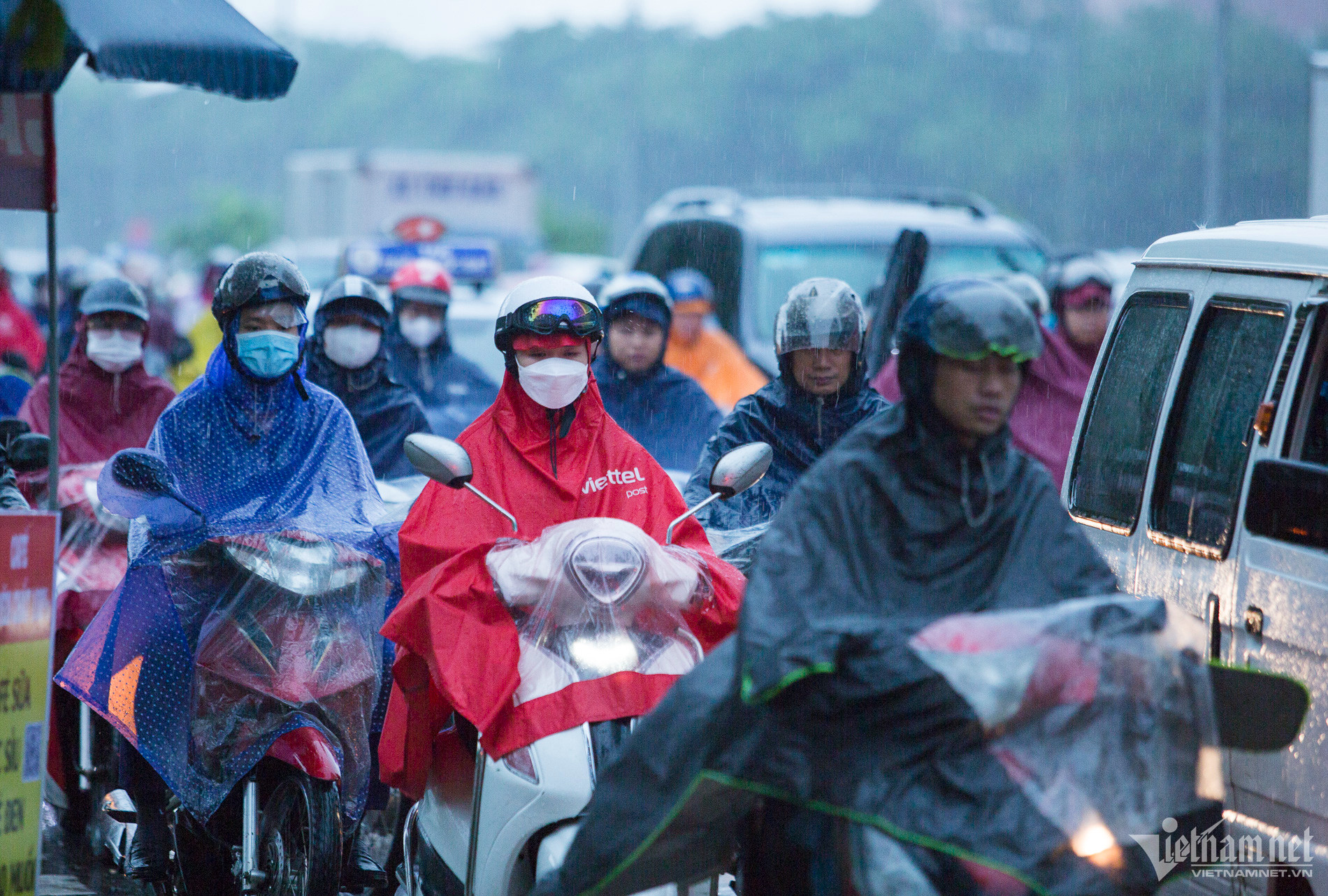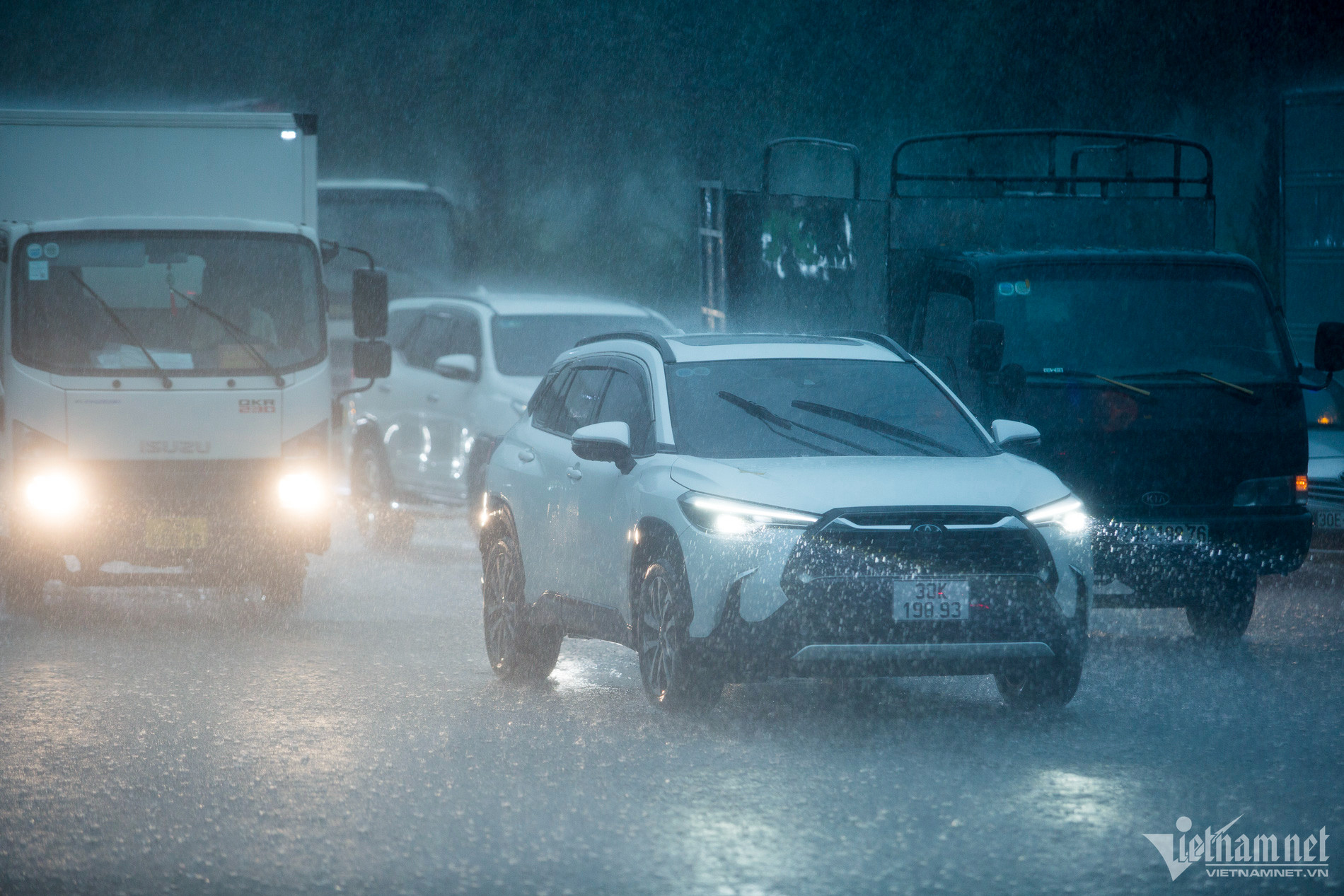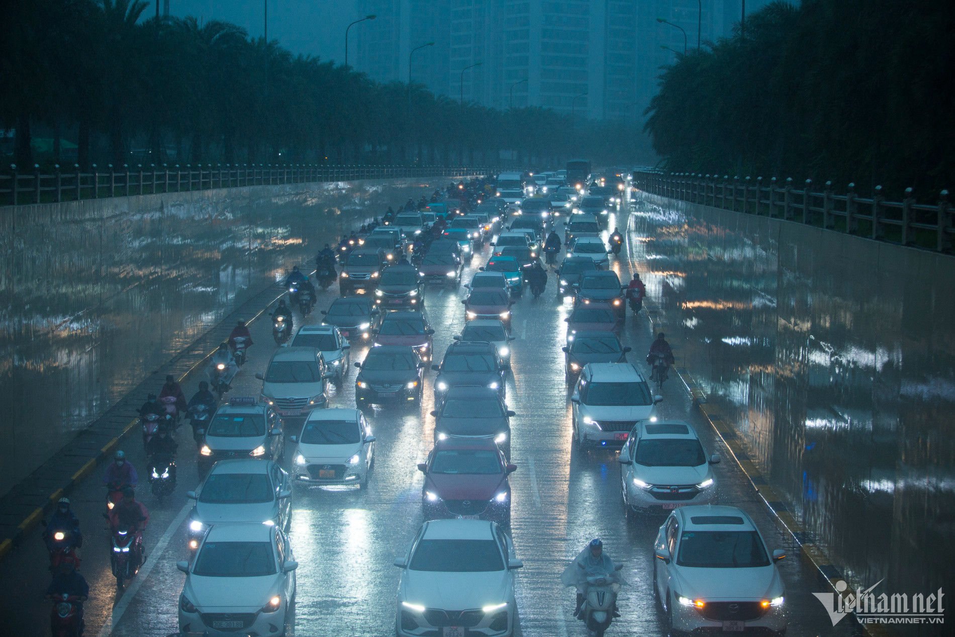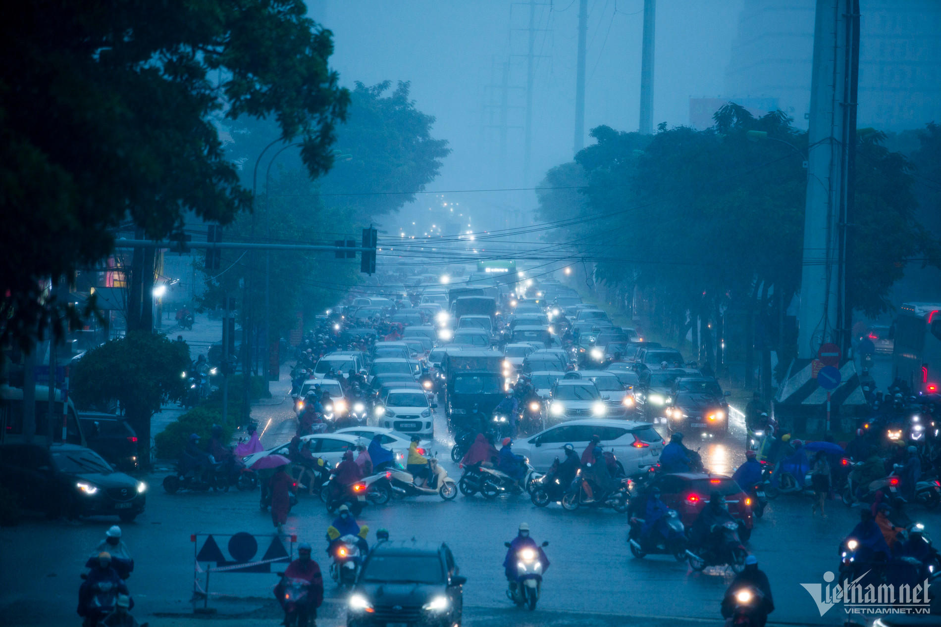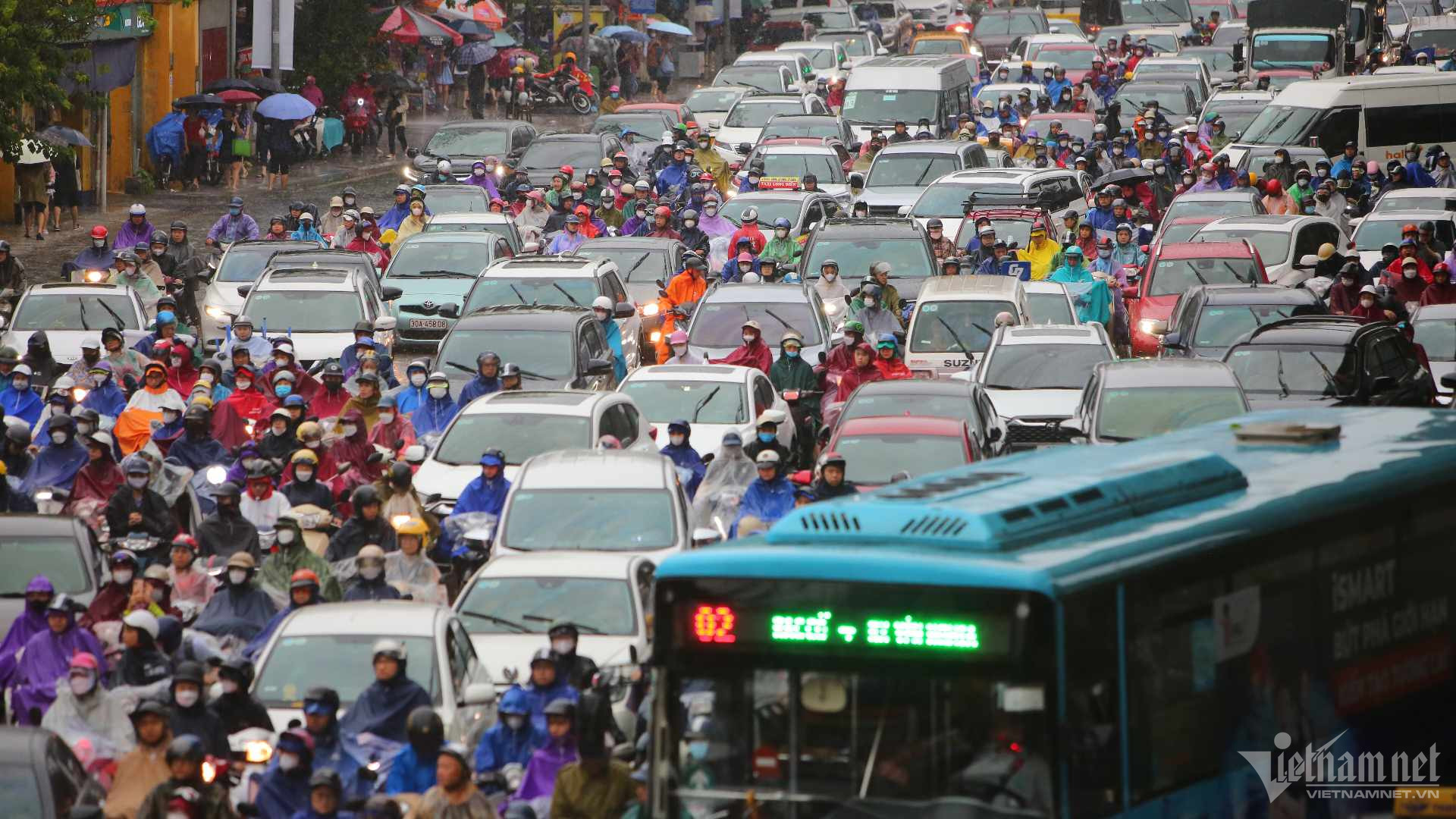 Khắp ngả đường kẹt cứng phương tiệnCác phương tiện phi lên vỉa hè tìm lối thoátTại đường Trần Duy Hưng, mưa lớn gây ngập khoảng 40cm, các phương tiện di chuyển rất khó khăn.Xe máy chật vật di chuyển khi trời mưa và gió lớn.Tại đường Hoàng Minh Giám, lượng nước mưa ngập khoảng 40 - 50cm.Người dân vất vả trên đường đi làmÔ tô và xe máy nhích từng mét trên đường đại lộ Thăng Long hướng ra đường vành đai 3.Tại hầm chui Trung Hòa, các phương tiện phải bật đèn xe.Đến 9h40, Hà Nội vẫn mưa trắng trời, chưa có dấu hiệu ngớt. Nhiều người vẫn "chôn chân" dưới mưa, chưa tới được nơi làm việc