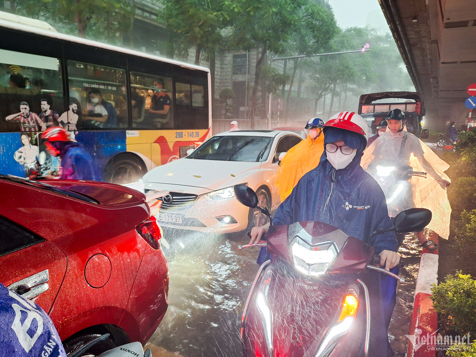 Ghi nhận lúc 8h15, mưa lớn khiến đường Nguyễn Trãi lênh láng nướcNgười dân chật vật tới nơi làm việcĐường Nguyễn Trãi (đoạn qua Trường Đại học Hà Nội) kín phương tiện Mưa lớn khiến tình trạng kẹt xe trở nên trầm trọng
