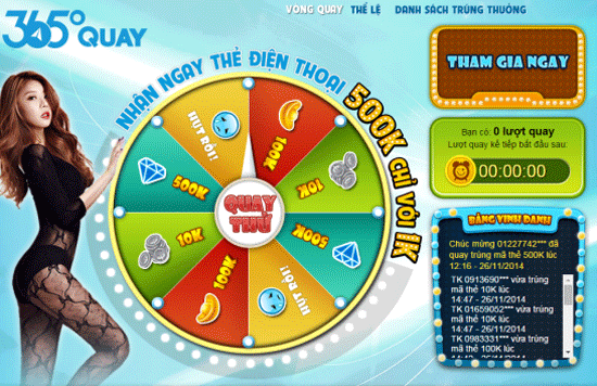 Khách hàng chỉ cần đăng nhập đã được tặng ngay 3 lượt quay miễn phí, đồng thời cứ 2 tiếng sẽ lại được tặng thêm 1 lượt. Quay trúng giải thưởng 100.000 đồng hay 500.000 đồng, khách hàng sẽ được mua thẻ điện thoại với giá 1.000 đồng, còn với giải thưởng 10.000 đồng thì sự kiện sẽ tặng miễn phí cho khách hàng. Chính vì thế mà cơ hội trúng thưởng của người chơi rất cao và rất nhiều khách hàng đã trúng thưởng chỉ sau vài lượt quay miễn phí.