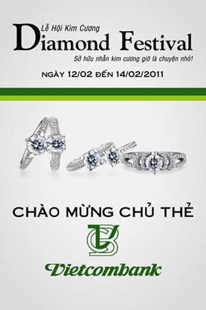 Theo đó, từ 12-14/2/2011 và 05-08/03/2011, các chủ thẻ tín dụng Vietcombank Visa, Vietcombank MasterCard, Vietcombank American Express mua hàng tại "Lễ hội Kim cương" trên hệ thống Thế giới Kim Cương sẽ được hưởng ưu đãi giảm giá đến 50% trên tất cả các mặt hàng.
