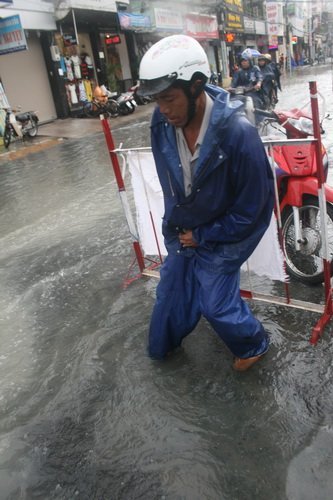 nước đánh bật lên và nước từ dưới phun lên ào ạt, mặt đường lún nhiều nơi có khả