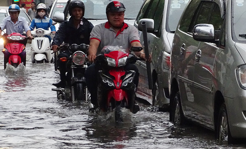 Mưa trắng phố khiến xe cộ phải bật đèn để di chuyển do tầm nhìn bị hạn chế. Trên tuyến đường Trường Sơn ra sân bay Tân Sơn Nhất ngập nặng Đoạn đường thi công dở dang (đường Bạch Đằng, quận Tân Bình) trở thành hố chứa nước sau cơn mưa chiều nay Nhiều người cố chạy qua đoạn đường ngập khiến nước bắn tung toé