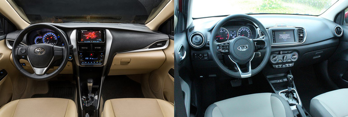 Về trang bị tiện ích, Vios 1.5E CVT được trang bị màn hình 7inch, đầu DVD/AUX/USB, Bluetooth và dàn âm thanh 4 loa. Về phía đối thủ Kia Soluto AT được trang bị màn hình AVN 7 inch, audio, bản đồ dẫn đường GPS và dàn âm thanh 6 loa.