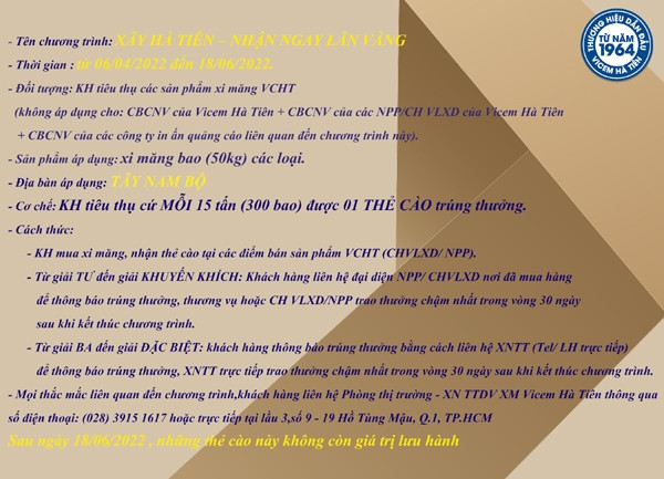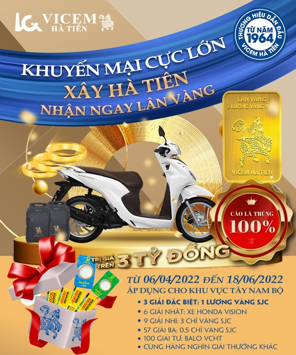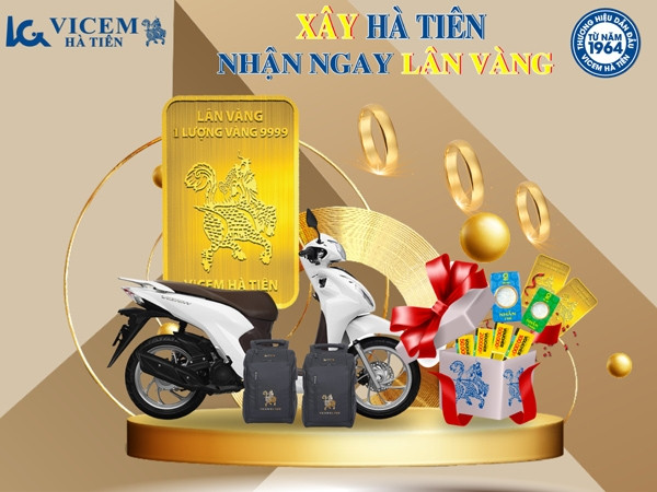 Công ty Cổ phần Xi măng Vicem Hà Tiên triển khai chương trình khuyến mãi mang tên “Xây Hà Tiên - Nhận ngay Lân vàng”, theo đó, khách hàng mua xi măng Vicem Hà Tiên có cơ hội trúng 3 Giải Đặc biệt 1 lượng Vàng miếng SJC 9999, dập ép in logo Vicem Hà Tiên và 6 giải Nhất xe máy Honda Vision phiên bản cá tính.