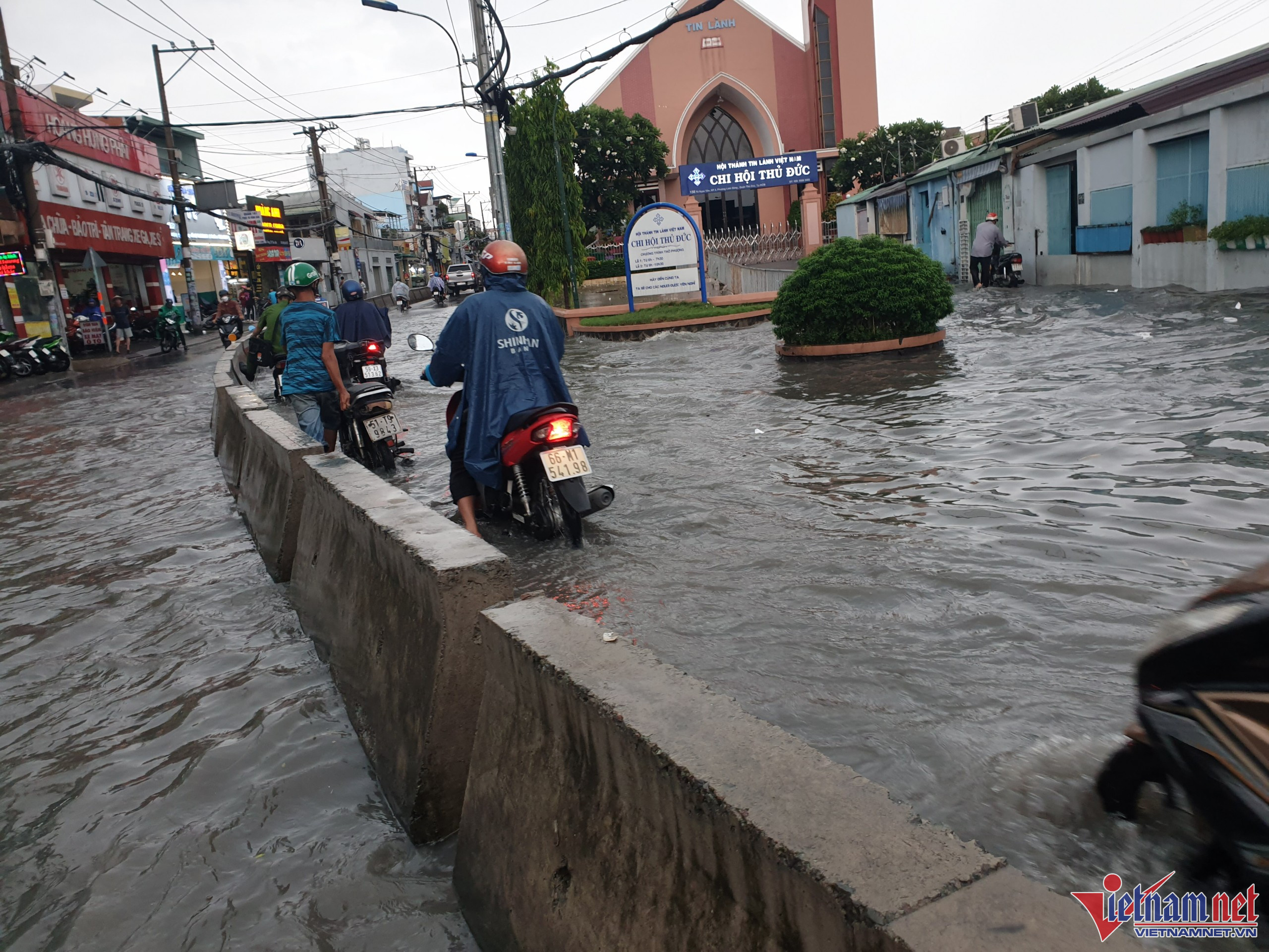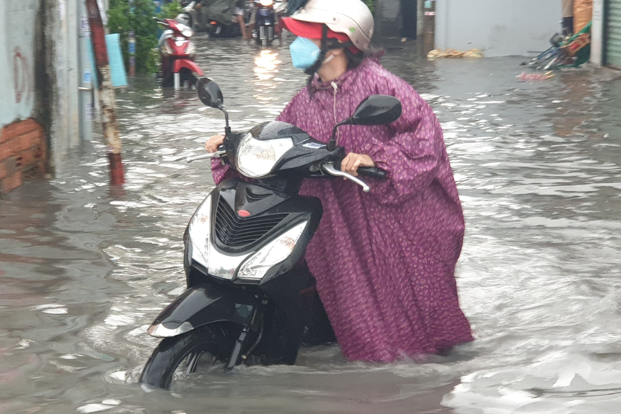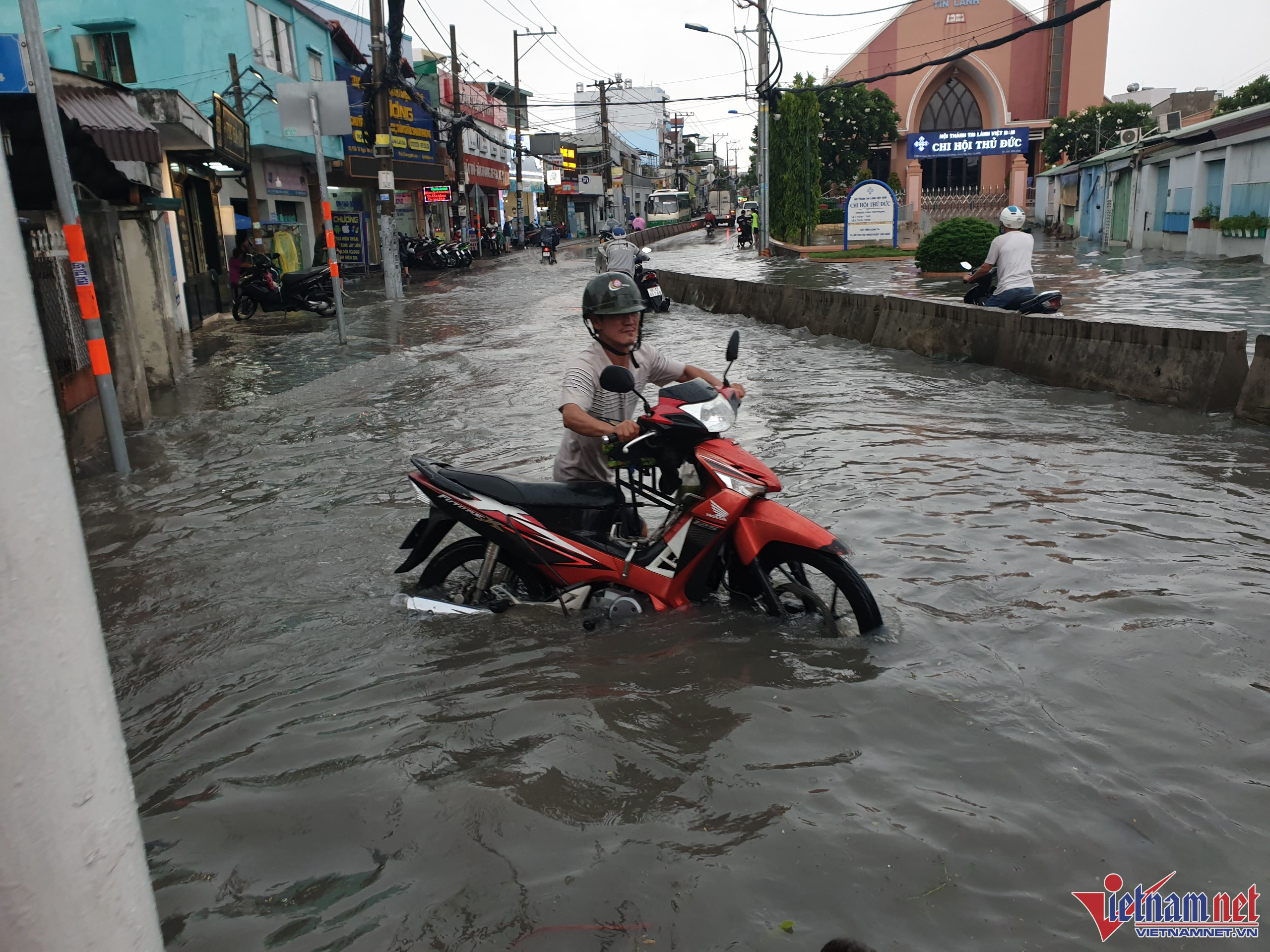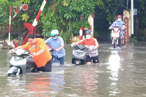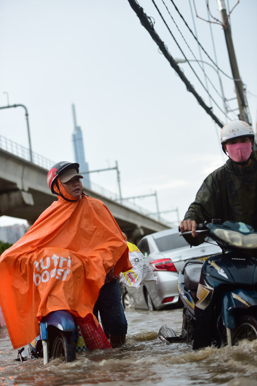 Ghi nhận, từ 15h30 trên đường Tô Ngọc Vân (đoạn gần đường ray xe lửa, thuộc khu vực TP Thủ Đức), mưa gây ngập lút bánh xe máy, hàng loạt xe phải dắt bộMột số xe lớn bất chấp để chạy qua, tạo thành sóng nước “xô” ngã các xe máy xung quanh