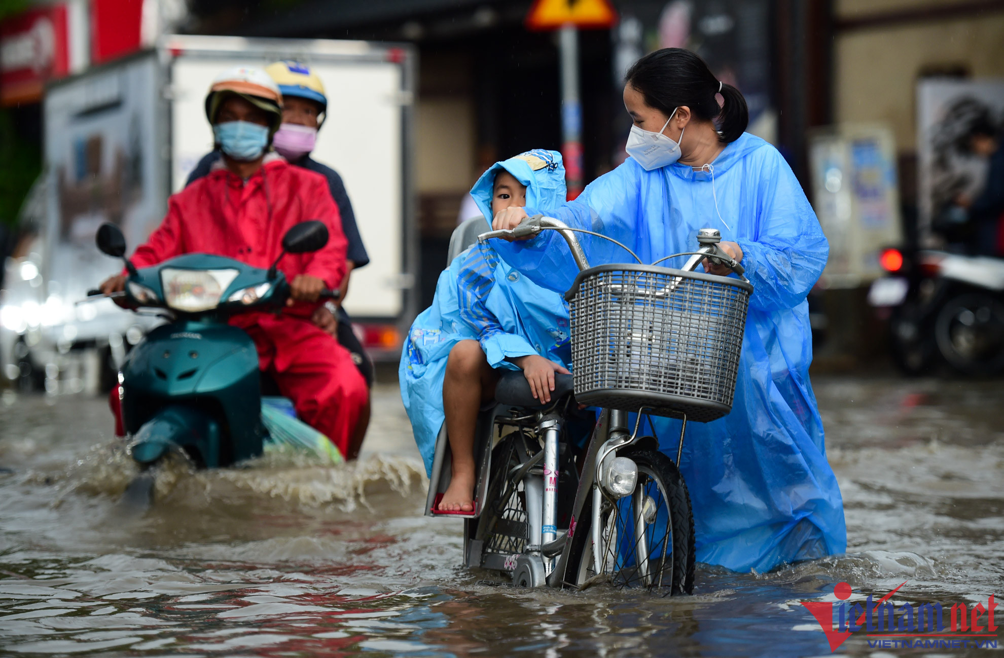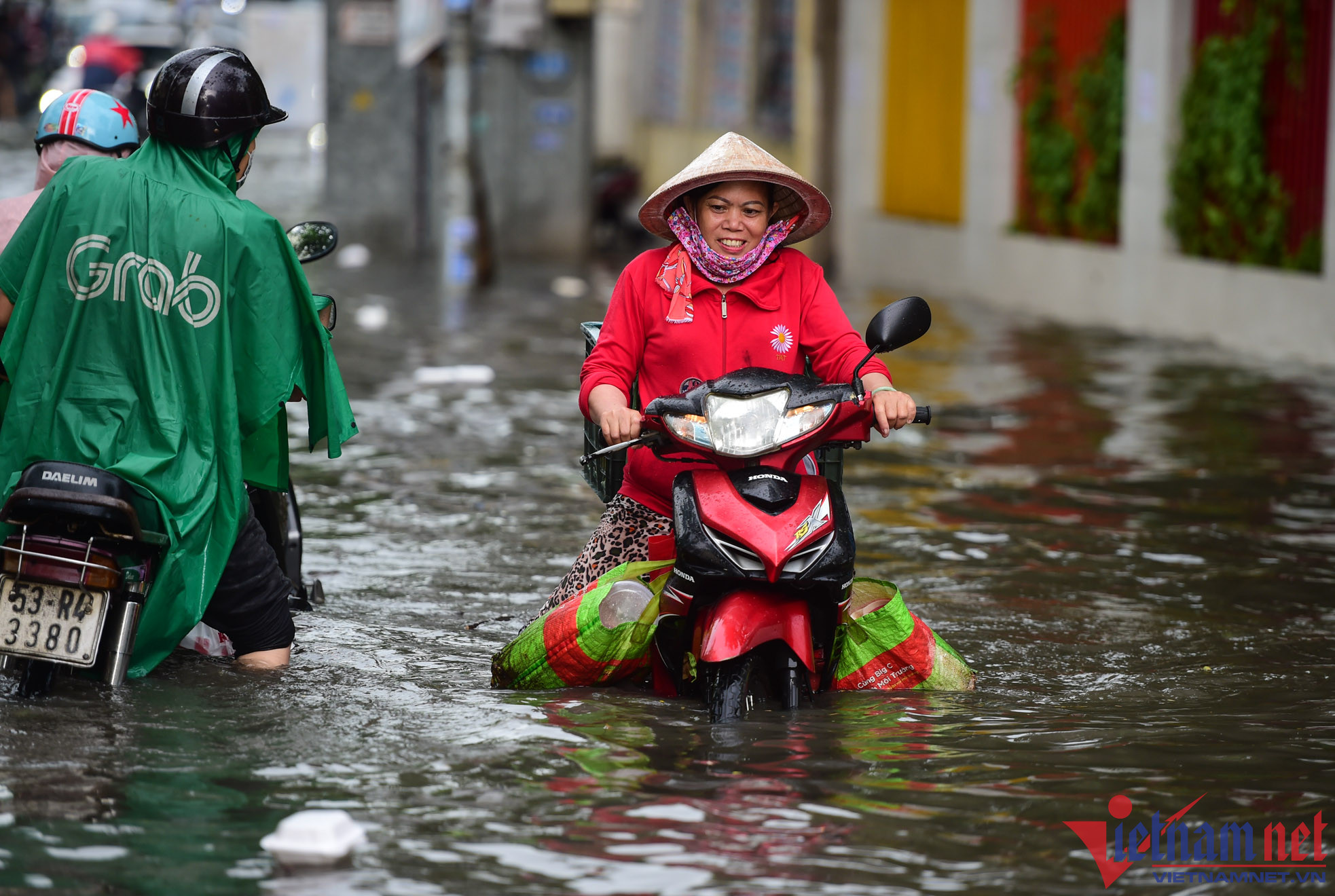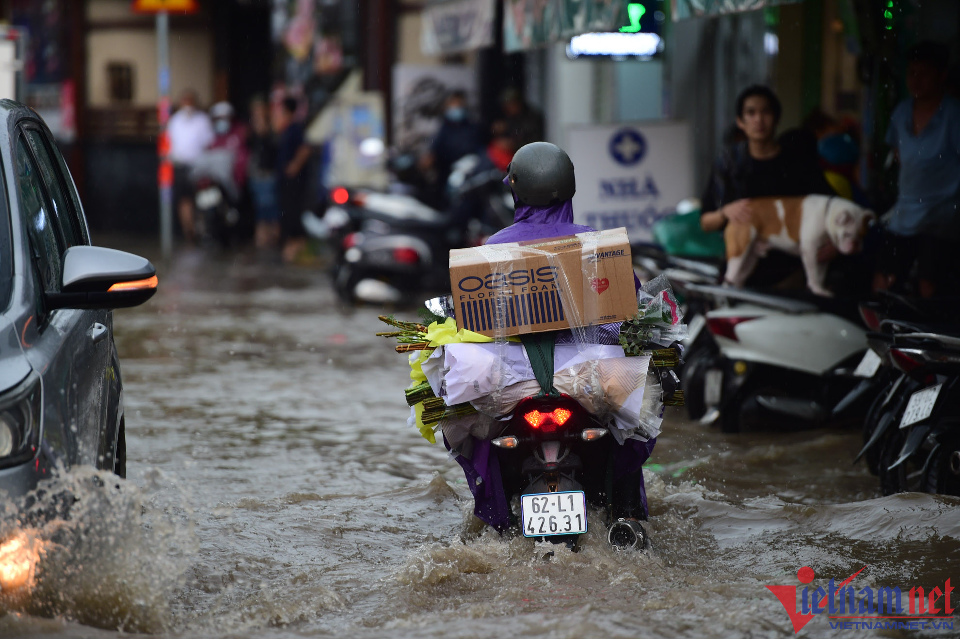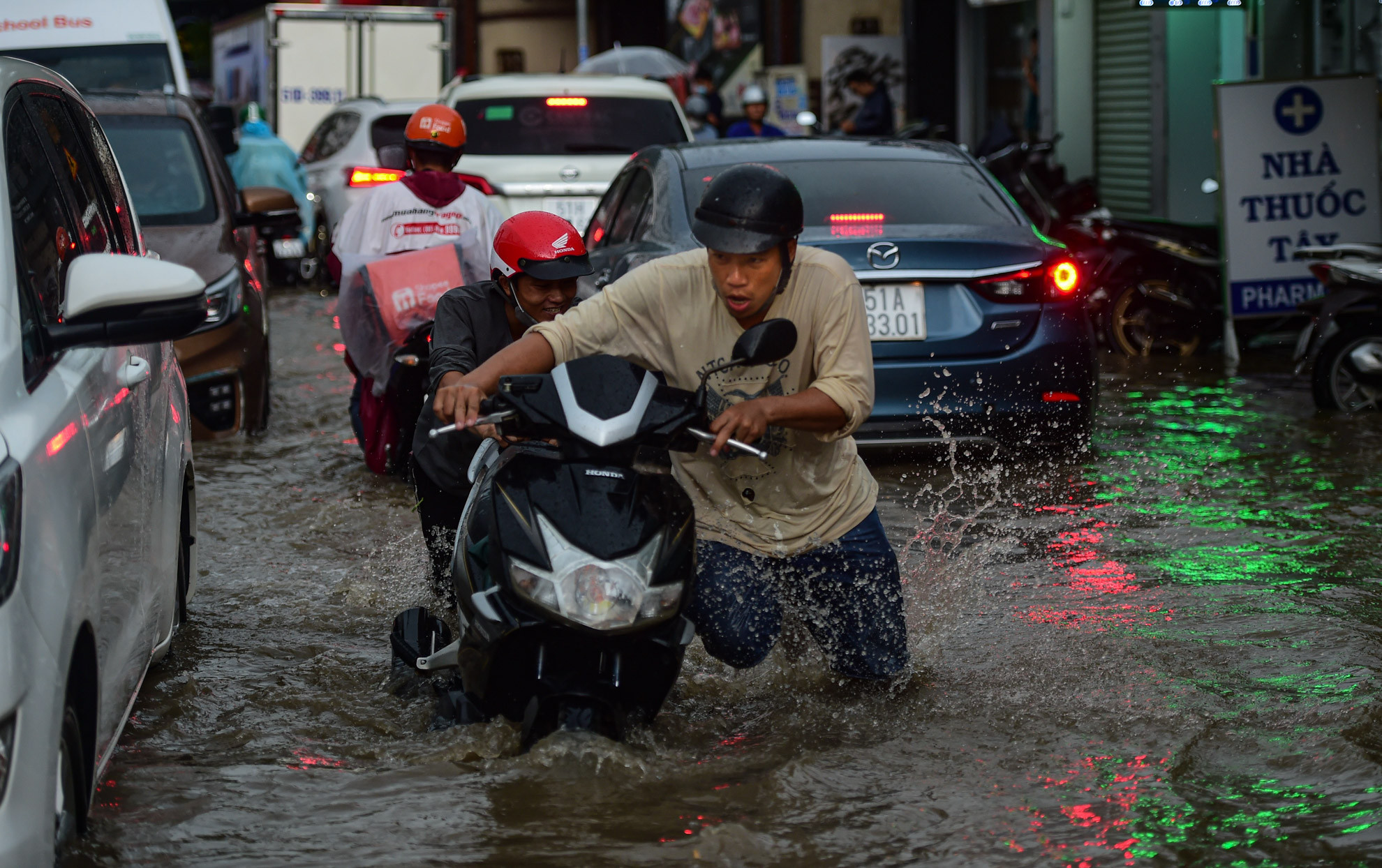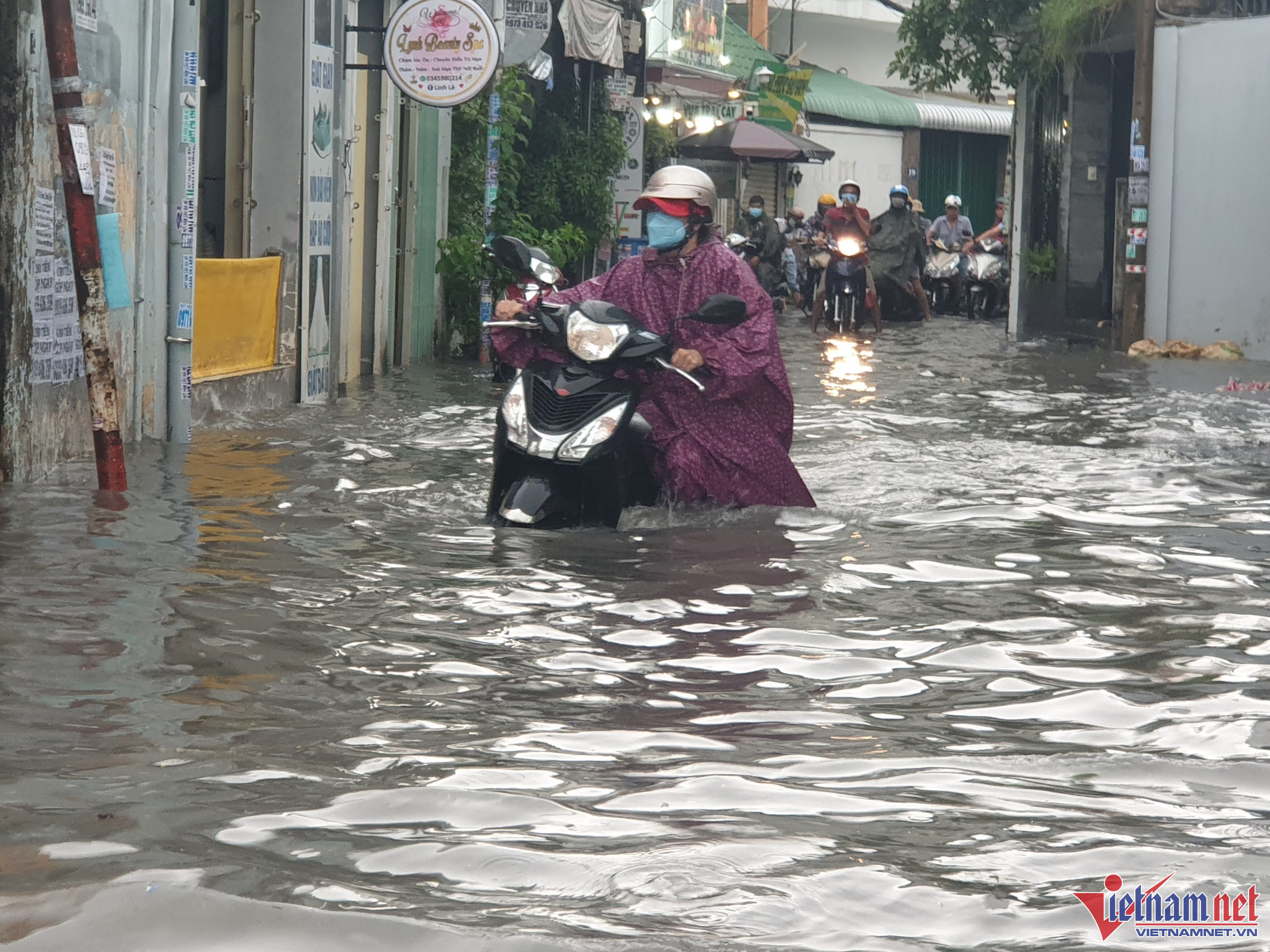 Ghi nhận, từ 15h30 trên đường Tô Ngọc Vân (đoạn gần đường ray xe lửa, thuộc khu vực TP Thủ Đức), mưa gây ngập lút bánh xe máy, hàng loạt xe phải dắt bộMột số xe lớn bất chấp để chạy qua, tạo thành sóng nước “xô” ngã các xe máy xung quanh
