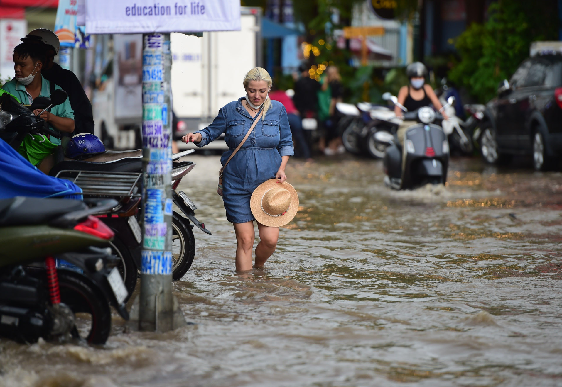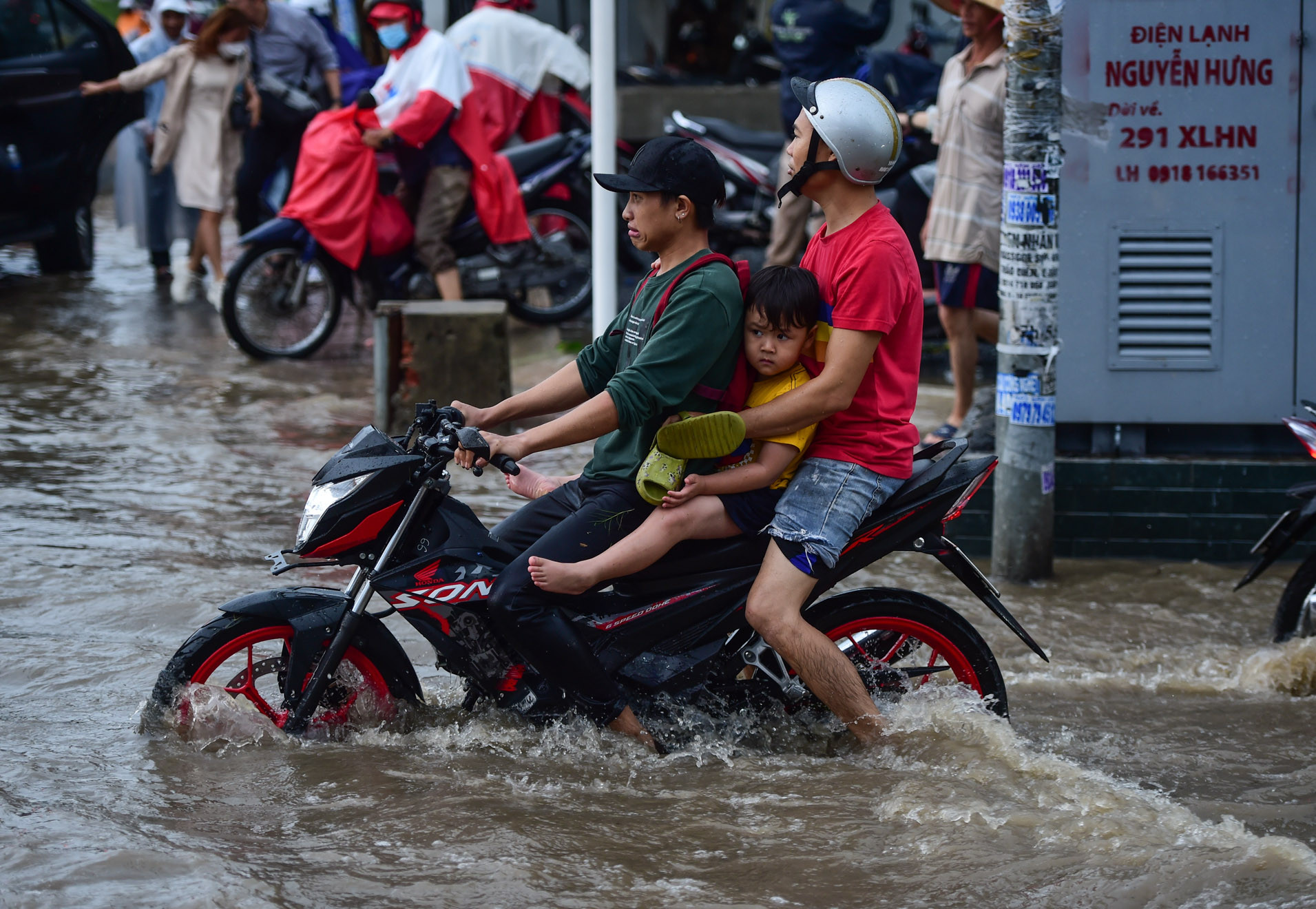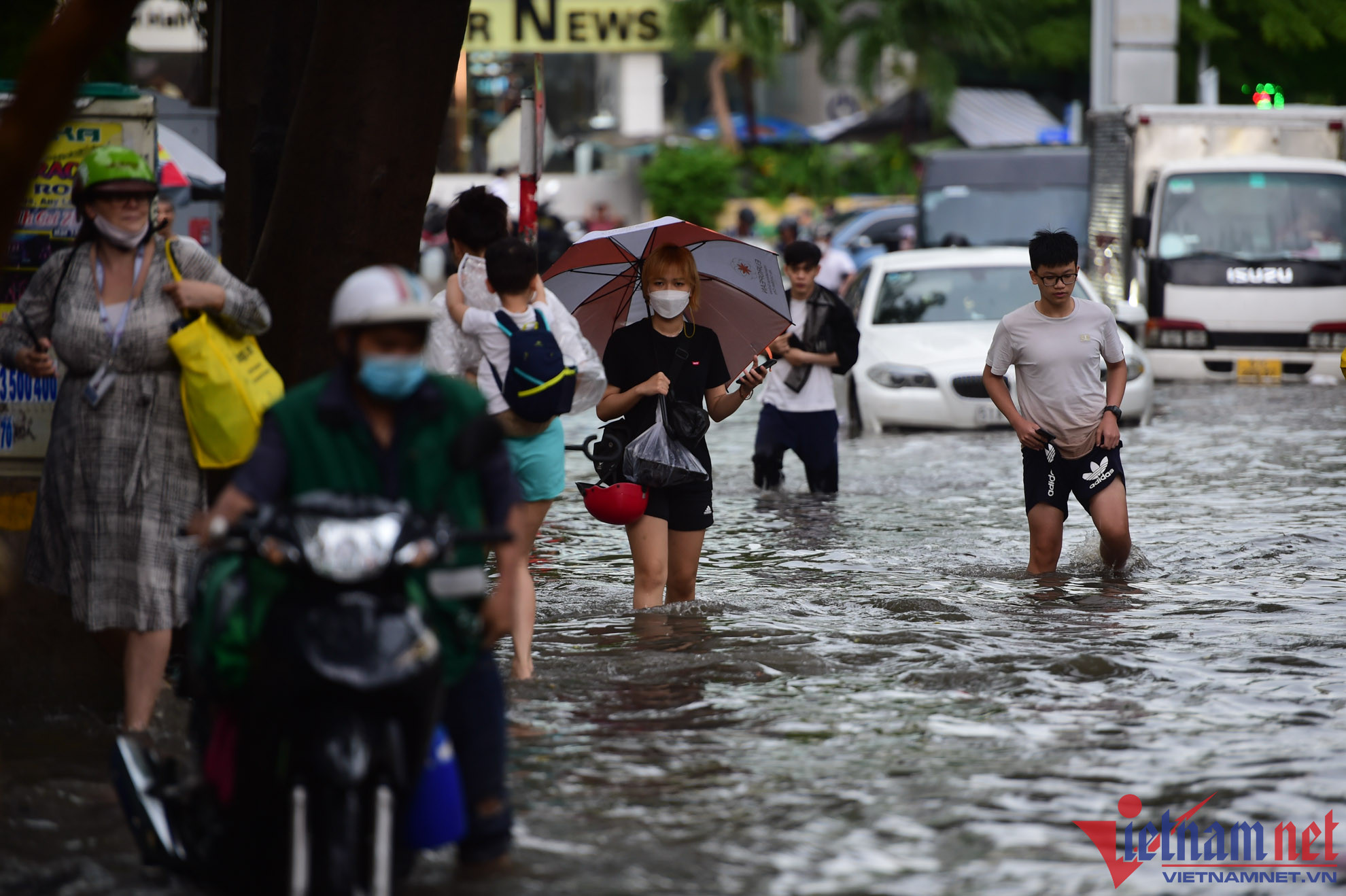 Chị Quyên đưa con đi học từ TP Thủ Đức về băng qua đường ngập Thảo Điền sau cơn mưa chiều 22/6Người dân bì bõm lội nước về nhà sau cơn mưa lớn chiều 22/6 trên đường Thảo ĐiềnNgười dân vất vả di chuyển qua đường ngập Quốc HươngNhiều ô tô chết máy