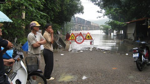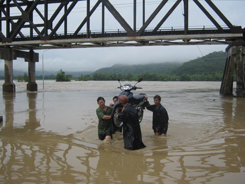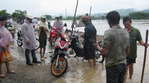 Cầu La Hai, cửa ngõ vào huyện Đồng Xuân bị ngập sâu gần 2m, hàng trăm người qua lại đây phải khiêng xe qua mố cầu rồi vượt qua đường sắt.