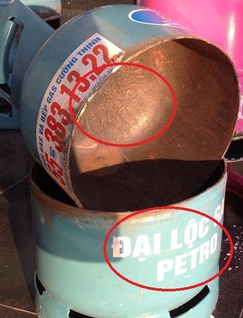 Một bình gas "ăn cắp" bị mổ, kết quả cho thấy nhãn hiệu sơn ngoài và chữ dập bên trong chẳng liên quan gì nhau