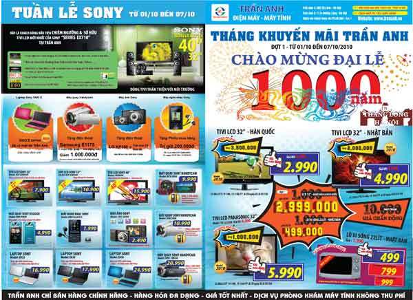 "Đại lễ 1.000 năm Thăng Long - Hà Nội" đã khởi động tại Trần Anh Điện máy - Máy tính từ ngày 24/9 - 30/9 và trong khuôn khổ tháng khuyến mãi (24/9 - 24/10) chào mừng Đại lễ, tại đây sẽ có 10.000 sản phẩm giá chấn động.