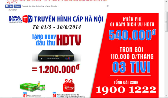 Nhân mùa World Cup sắp đến, gia đình chị Hương (tổ 10, phường Khương Đình, Thanh Xuân, Hà Nội) tìm hiểu để lựa chọn sử dụng dịch vụ truyền hình HD. Chị Hương cho biết, chị đã được một phen mừng hụt vì cách quảng cáo giá cước dịch vụ truyền hình HD của Truyền hình cáp Việt Nam (VTVcab). Khi vào trang web giới thiệu dịch vụ của nhà đài này, chị Hương đọc luôn được bài quảng cáo "Cực đỉnh với cơn lốc đầu thu HD của VTVcab", theo đó, từ ngày 10/5 - 25/6/2014, VTVcab trang bị miễn phí đầu thu HD đến từng hộ gia đình tại Hà Nội khi khách hàng đăng ký 6 tháng thuê bao gói kênh HD trị giá 300.000 đồng.