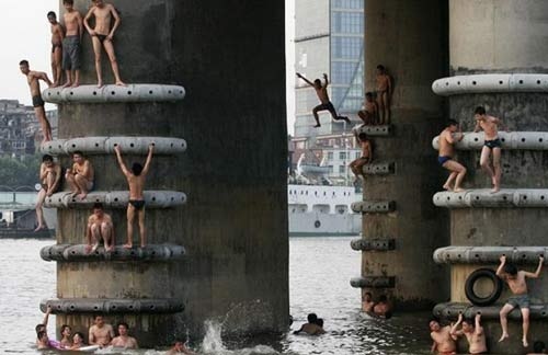 Những đứa trẻ ở Vũ Hán, Trung Quốc, cũng chọn cách ngâm mình trong nước dưới chân một cây cầu để chống nóng. (Ảnh: Reuters) |