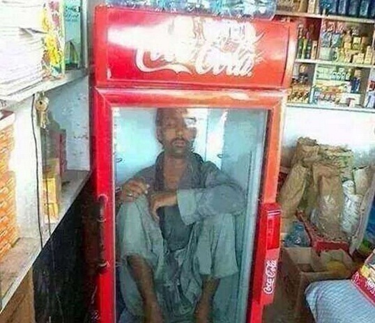 Còn người này thì tránh nóng bằng cách chui vào tủ kính và ôm lấy những túi đá. (Ảnh: Atchuup) |