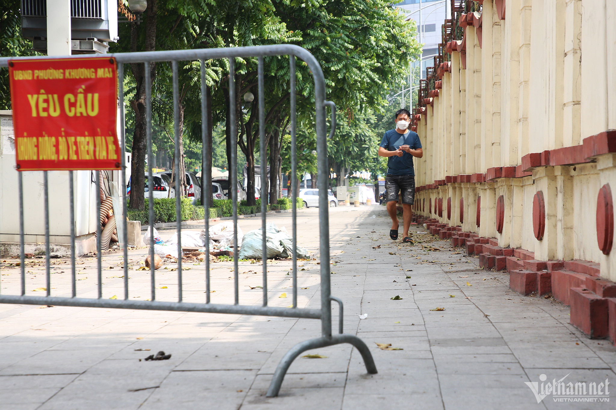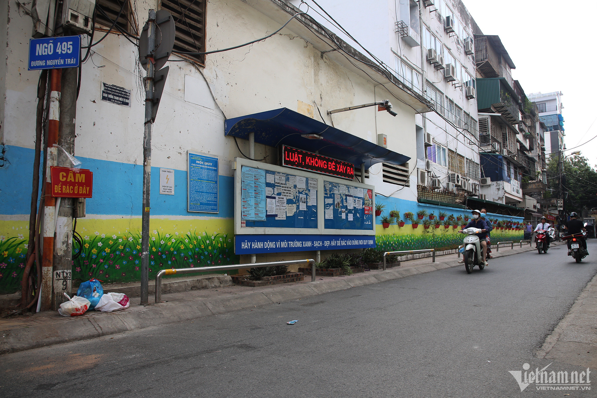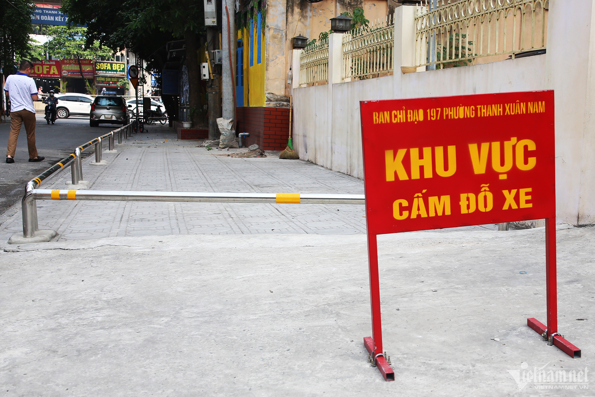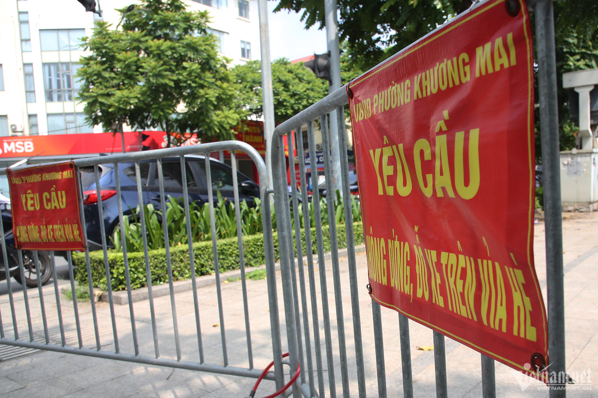 Còn tại ngõ 477 đường Nguyễn Trãi, do vỉa hè ở đây khá rộng nên lực lượng chức không chỉ dựng rào dọc theo vỉa hè mà còn rào chắn ngang.