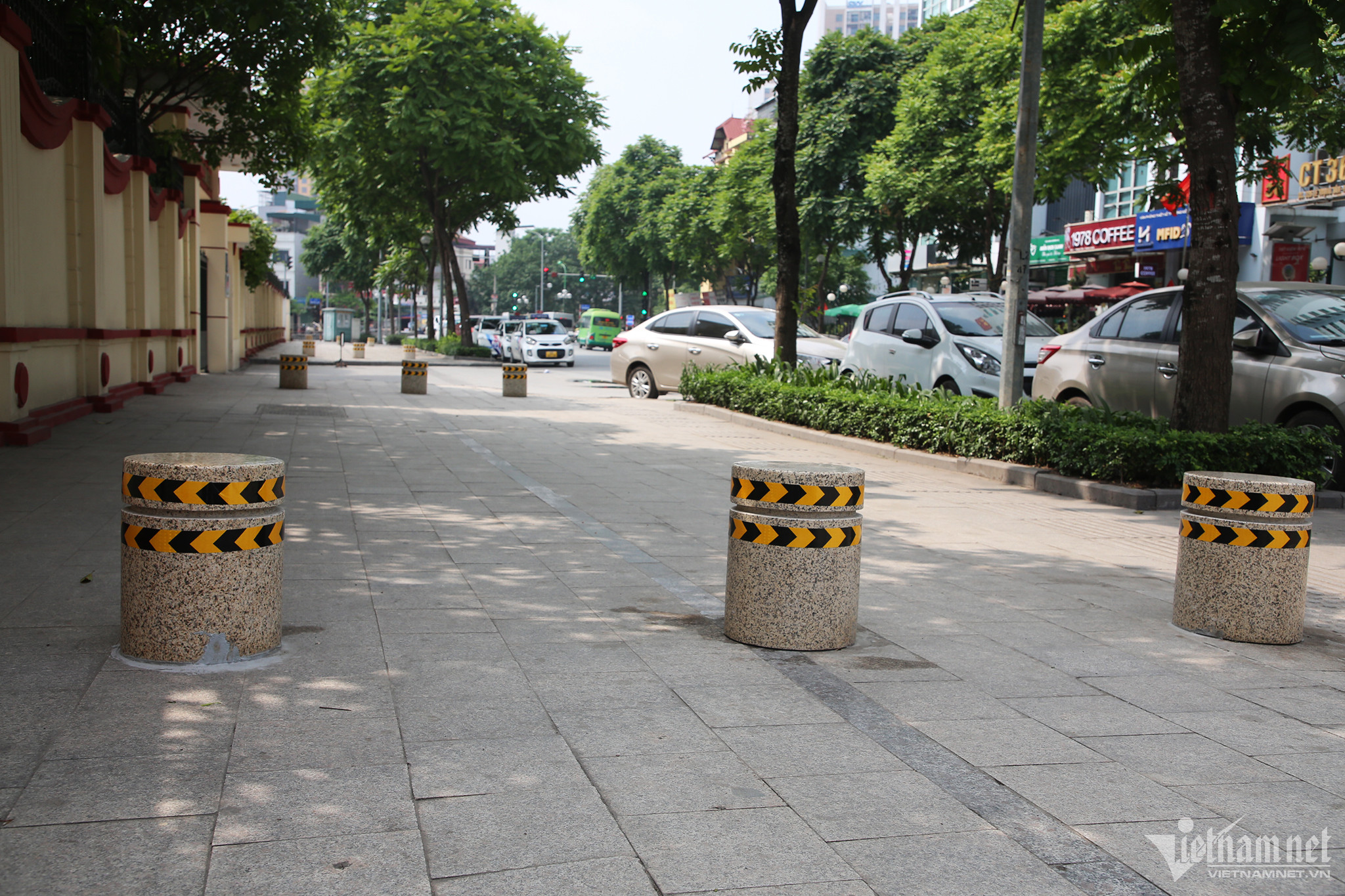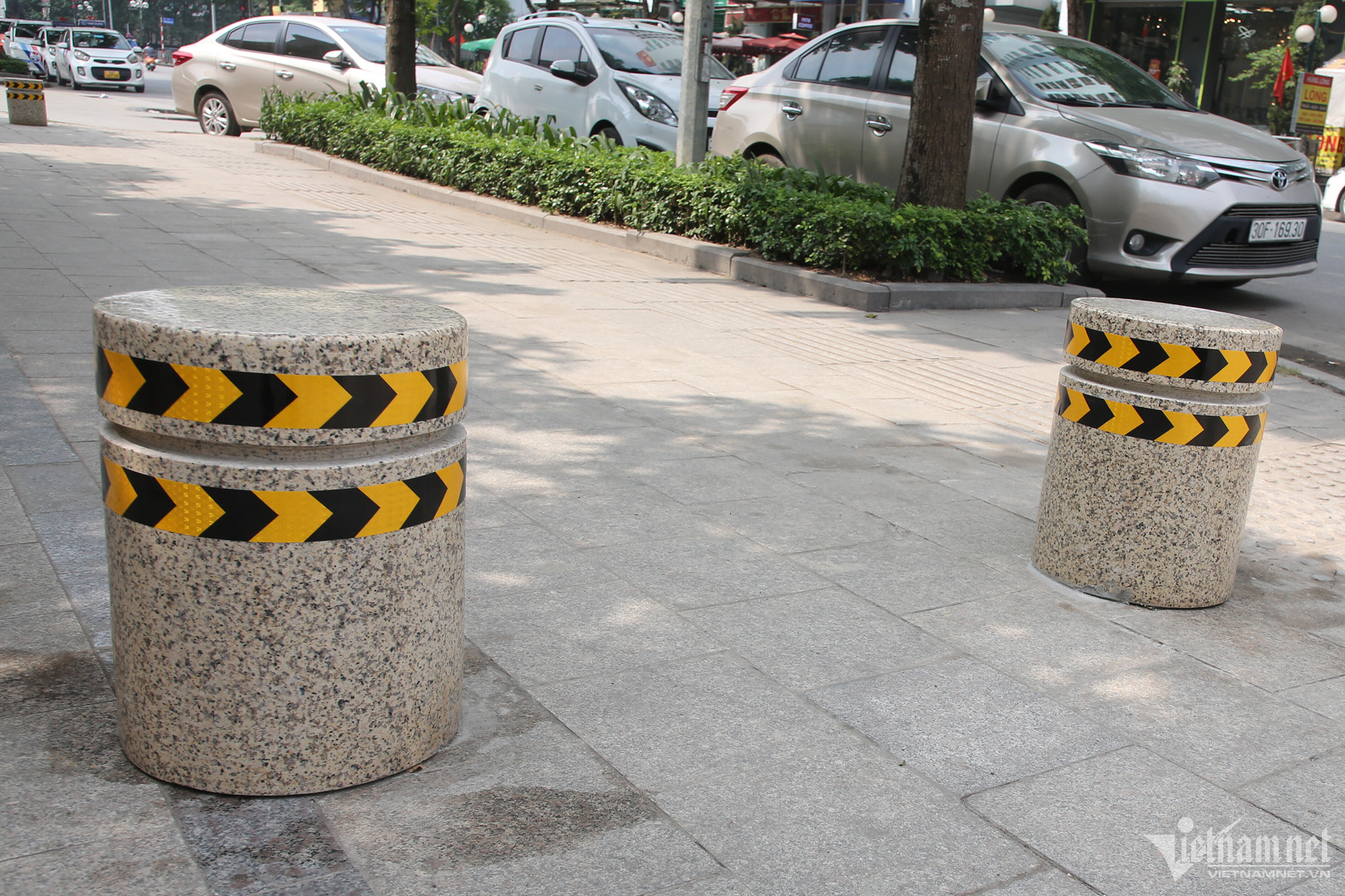 Ghi nhận của VietNamNet, tại mỗi điểm lên xuống vỉa hè, lực lượng chức năng cho đặt 3 trụ đá, mỗi trụ cách nhau khoảng 1,2m. Các trụ này cao khoảng 50cm, đường kính 35cm và được dán phản quang để người đi bộ dễ quan sát.