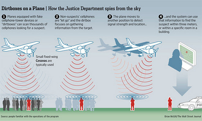 Chương trình do thám này bắt đầu từ năm 2007 và được Cục Cảnh sát thuộc Bộ Tư pháp Mỹ triển khai tại ít nhất 5 thành phố. Các máy bay loại nhỏ chở theo thiết bị gọi là “dirtbox” có thể “lừa” hàng ngàn điện thoại di động để kết nối với chúng. Bằng cách này, nhà chức trách thu hẹp phạm vi điện thoại của một nghi phạm nào đó.