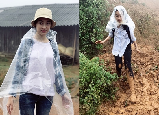 | Mỹ Linh dầm mưa, lội bùn để có thể đi đến thôn Cu Vai. |