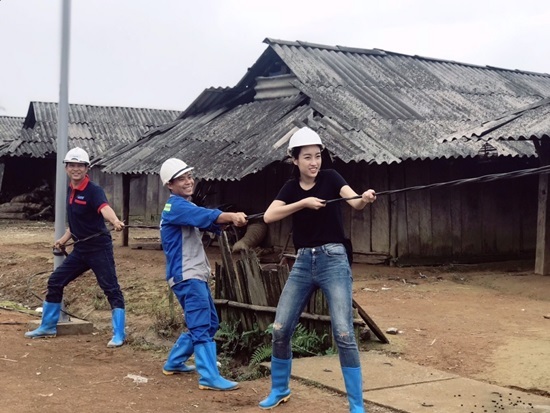 | Hình ảnh của Mỹ Linh trong dự án nhân ái Cõng điện lên bản. |