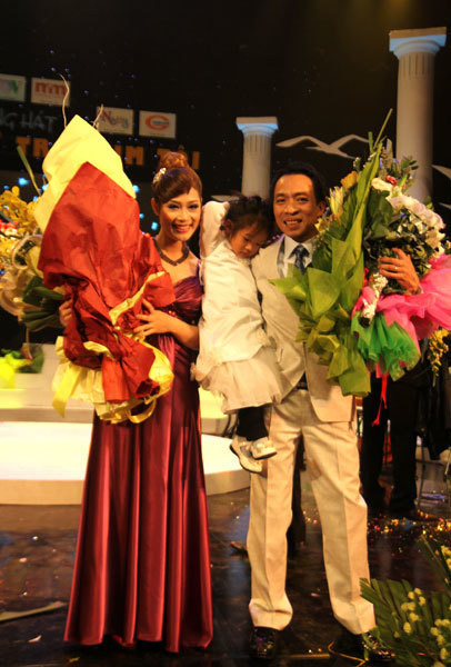 Vợ chồng ca sĩ Việt Hoàn và con gái chụp ảnh sau đêm diễn. Do chưa quen