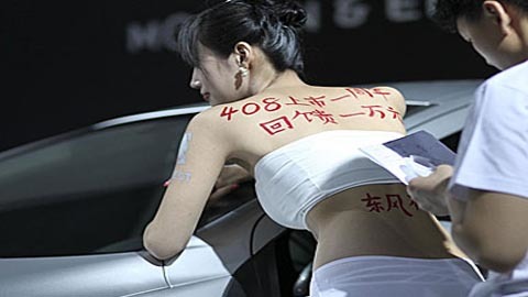 PG (Promotion Girl) này đã không ngần ngại chìa tấm lưng ngọc ngà của mình ra để một họa sỹ viết biểu ngữ: "Có mặt trên thị trường 1 năm, khuyến mãi 10.000 NDT" (khoảng 1.500 USD). Được biết, đây là chương trình khuyến mại nhân kỷ niệm 1 năm hãng Đông Phong ra mắt dòng xe Peugeot 408.