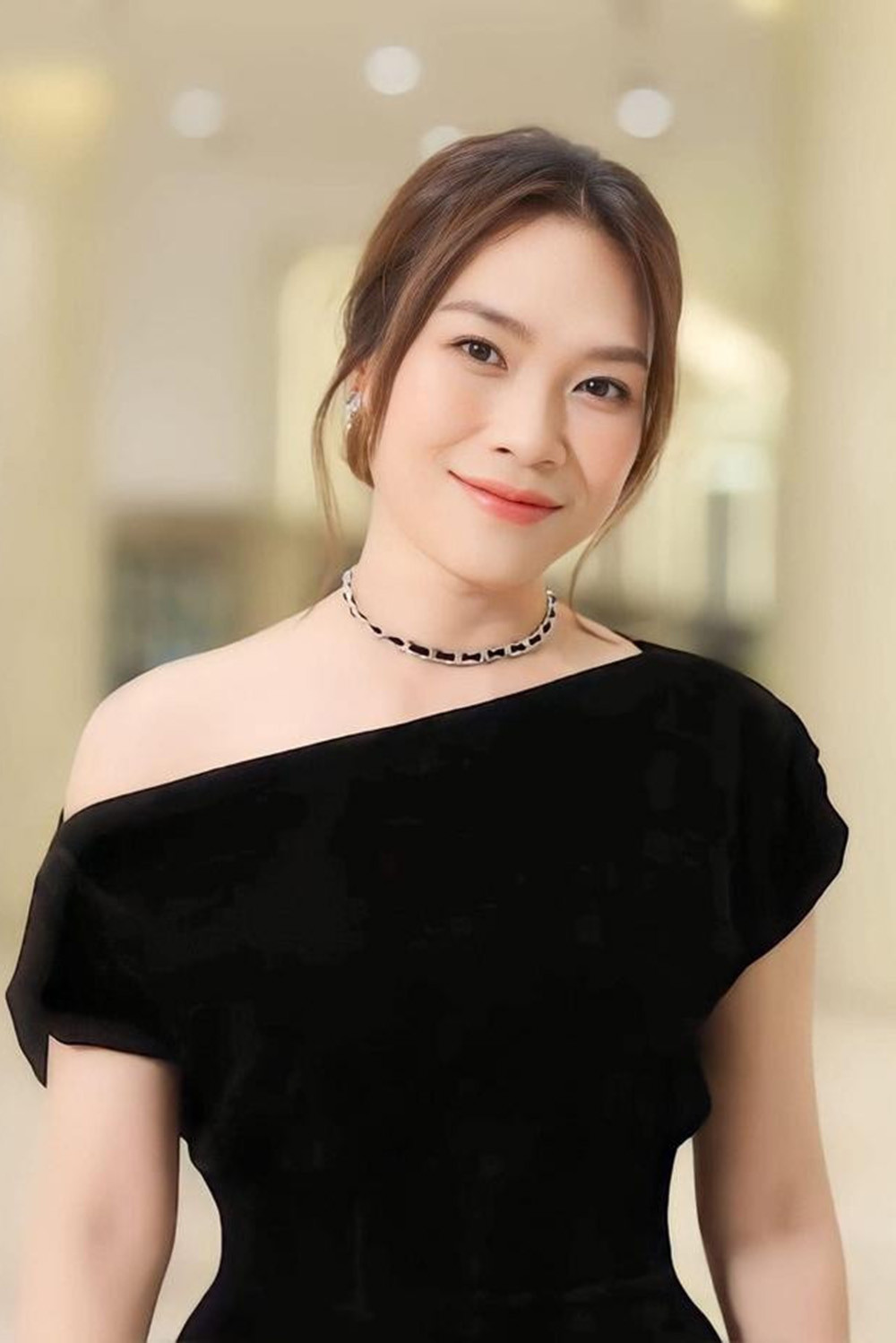 Nữ giám khảo quay trở lại phong cách nhẹ nhàng khi diện đầm đen lệch vai, cùng mái tóc được búi gọn.