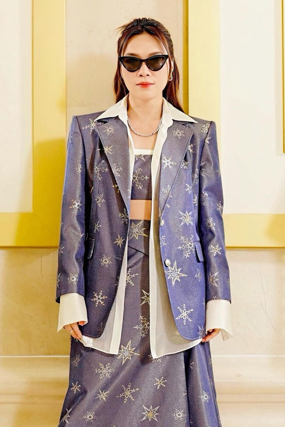 Mỹ Tâm xuất hiện trong phong cách ‘chị trợ lý’ với bộ suit cách điệu được siết eo có phần cổ V, phối cùng vòng hạt trai, thân dưới là quần baggy trẻ trung.