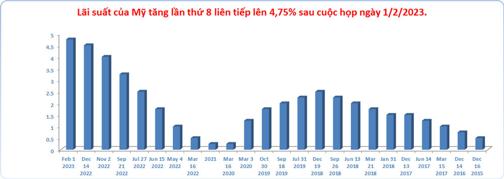Trong năm 2022, Fed đã tăng lãi suất 7 lần, với lần gần nhất là 50 điểm phần trăm (tháng 12) và 4 lần trước đó mỗi lần 75 điểm phần trăm (tháng 5, tháng 7, tháng 9 và tháng 11) trong một nỗ lực kìm hãm lạm phát vốn có thời điểm (tháng 6/2022) lên đỉnh 40 năm.
