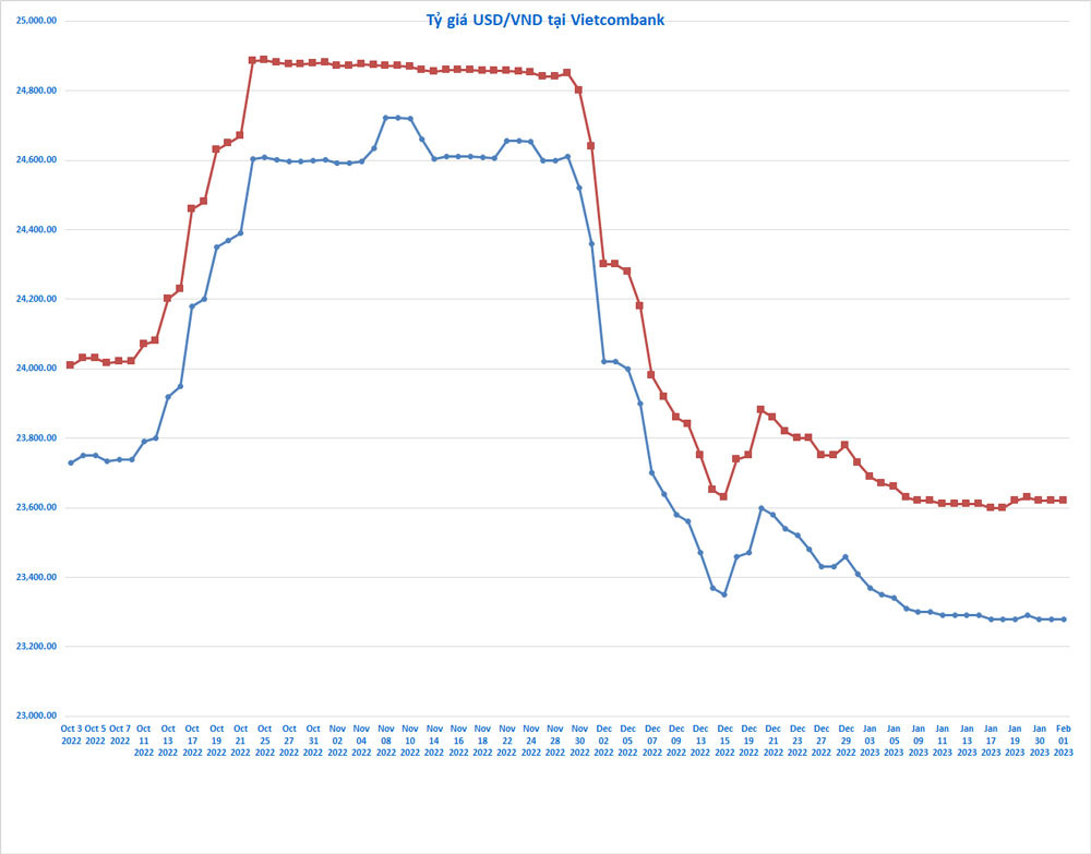 Trong nước tỷ giá USD/VND cũng đã ổn định trong khoảng 2 tháng qua. So với đỉnh 24.888 đồng/USD (giá bán tại Vietcombank) ghi nhận hôm 25/10, đồng USD đã giảm hơn 5,1%.