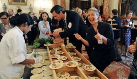 Để nấu ăn cho Thủ tướng Anh David Cameron hồi tháng 3, Bộ Ngoại giao Mỹ chọn đầu bếp April Bloomfield, chủ cửa hiệu Spotted Pig ở New York, người chào đời ở Anh. Menu đồ ăn gồm cá hồi Đại Tây Dương hầm, đậu lăng thảo mộc, thì là nướng, súp lơ và cà rốt nhỏ.