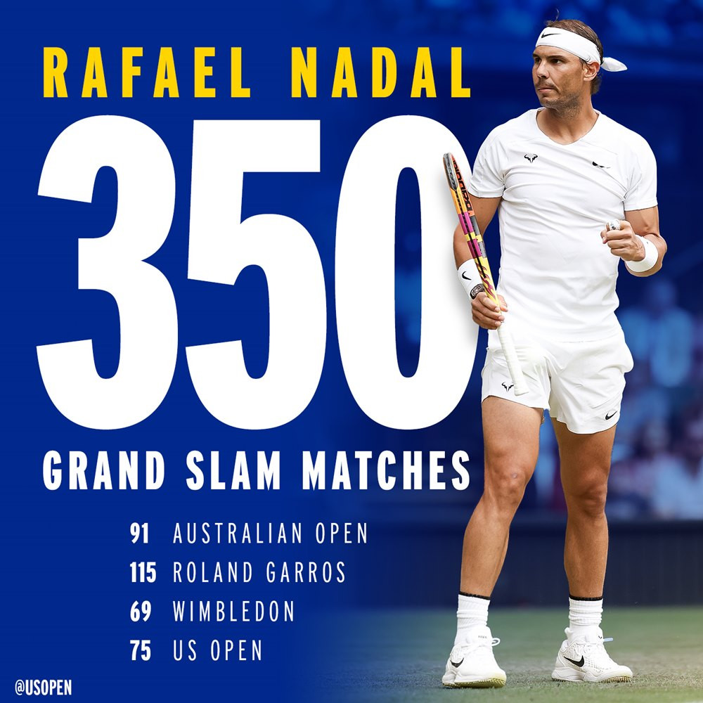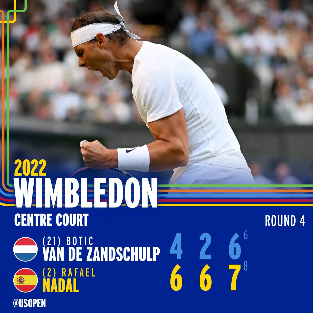 Đối đầu Botic Van De Zandschulp đánh dấu cột mốc thứ 350 trận đấu tại Grand Slam của Rafael NadalTay vợt sở hữu kỷ lục 22 danh hiệu Grand Slam dễ dàng thắng 6-4, 6-2 ở hai set đầu tiênHạt giống số 2 gặp đôi chút khó khăn ở set 3, nhưng bản lĩnh giúp Nadal thắng 8-6 ở loạt tie-break để khép lại trận đấuChiến thắng 6-4, 6-2 và 7-6(8-6) đưa tay vợt người Tây Ban Nha vào tứ kếtỞ vòng đấu dành cho 8 tay vợt mạnh nhất Wimbledon 2022, Nadal sẽ đối đầu Taylor Fritz