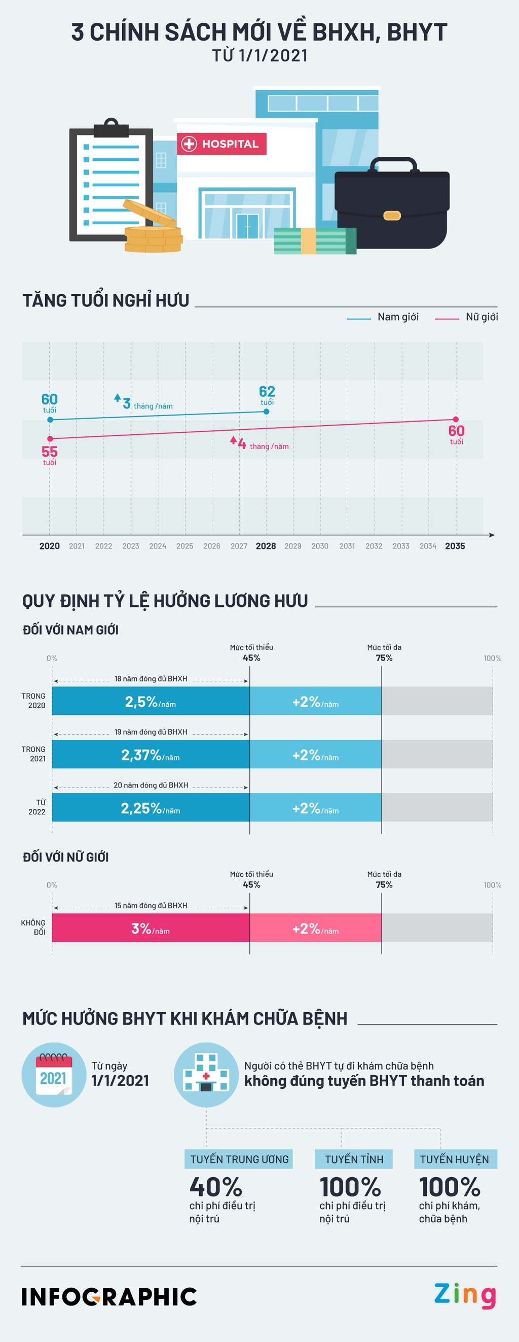Tuổi nghỉ hưu của lao động nam từ năm 2021 là đủ 60 tuổi 3 tháng và của lao động nữ là đủ 55 tuổi 4 tháng. Sau đó mỗi năm tăng 3 tháng với nam và 4 tháng với nữ.