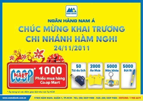 Nhân dịp khai trương CN Hàm Nghi, Nam A Bank dành hàng ngàn quà tặng có giá trị và nhiều ưu đãi cho các khách hàng giao dịch đầu tiên tại tất cả các điểm giao dịch khu vực TP.Hồ Chí Minh.