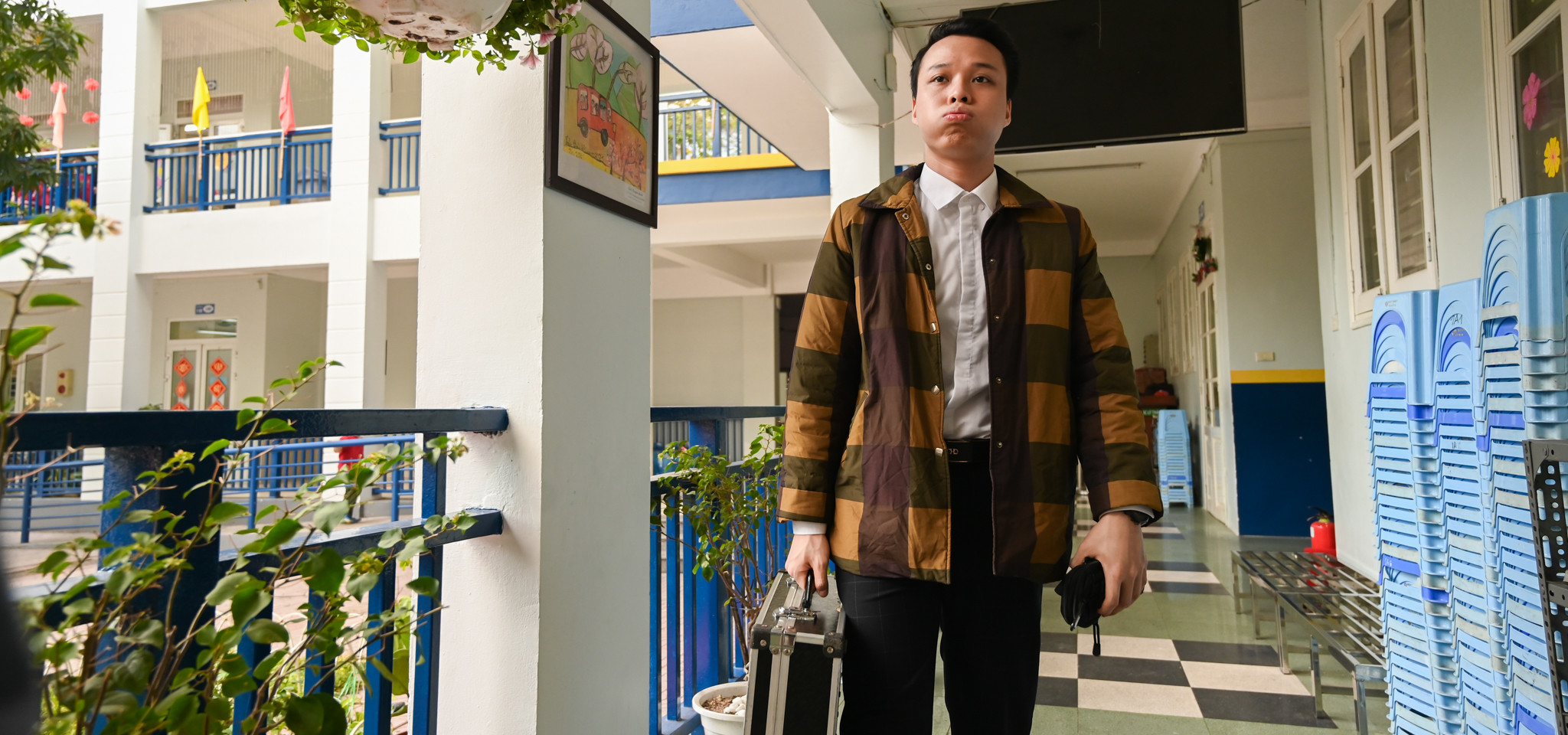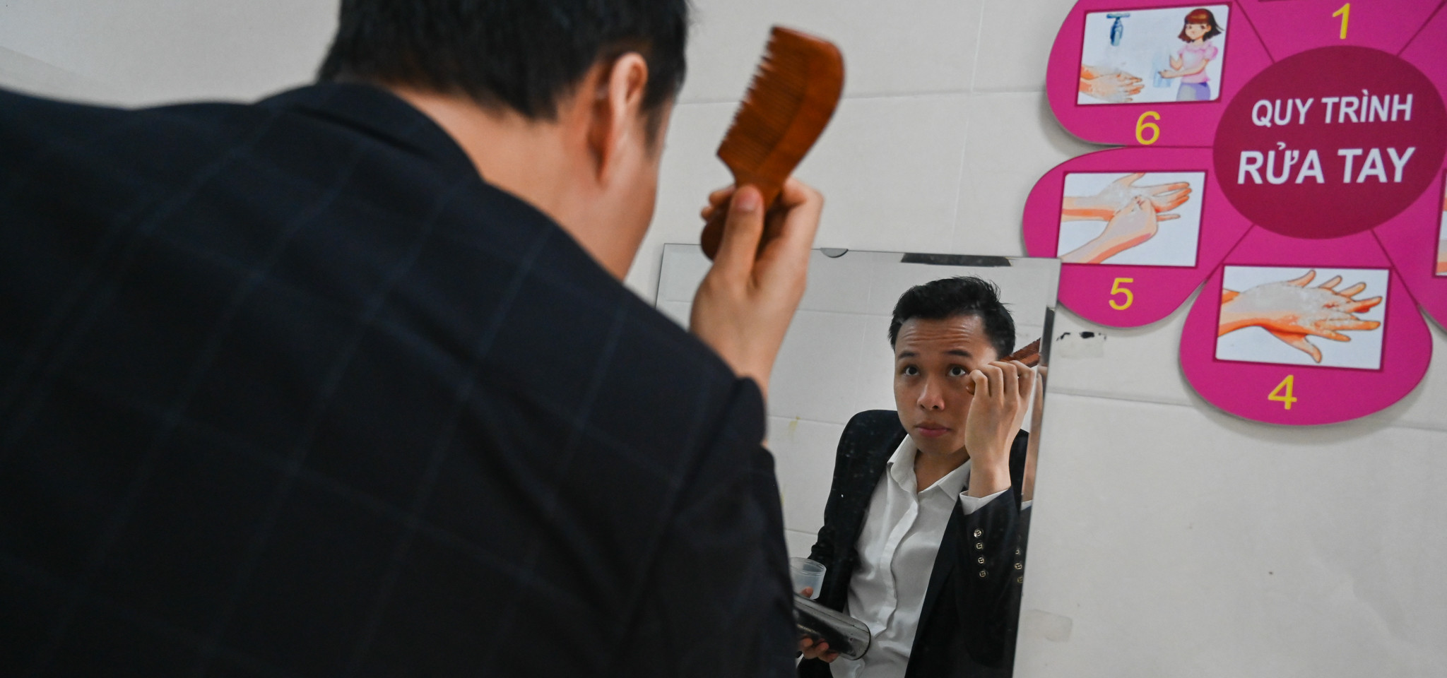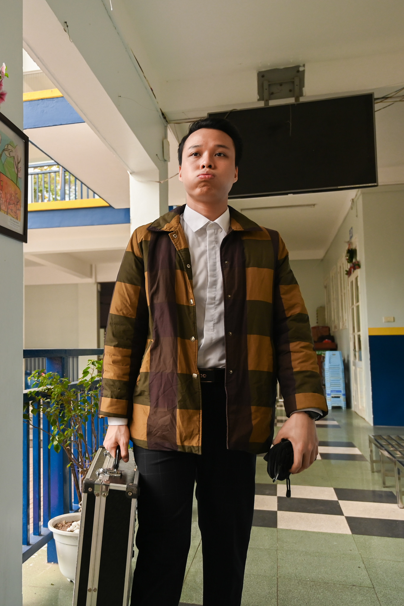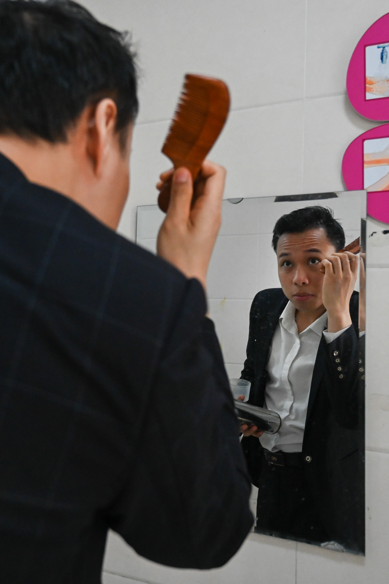 Trước khi bước vào lớp để trình diễn trước các em học sinh, Tuấn tự tay chỉnh sửa "nhan sắc".