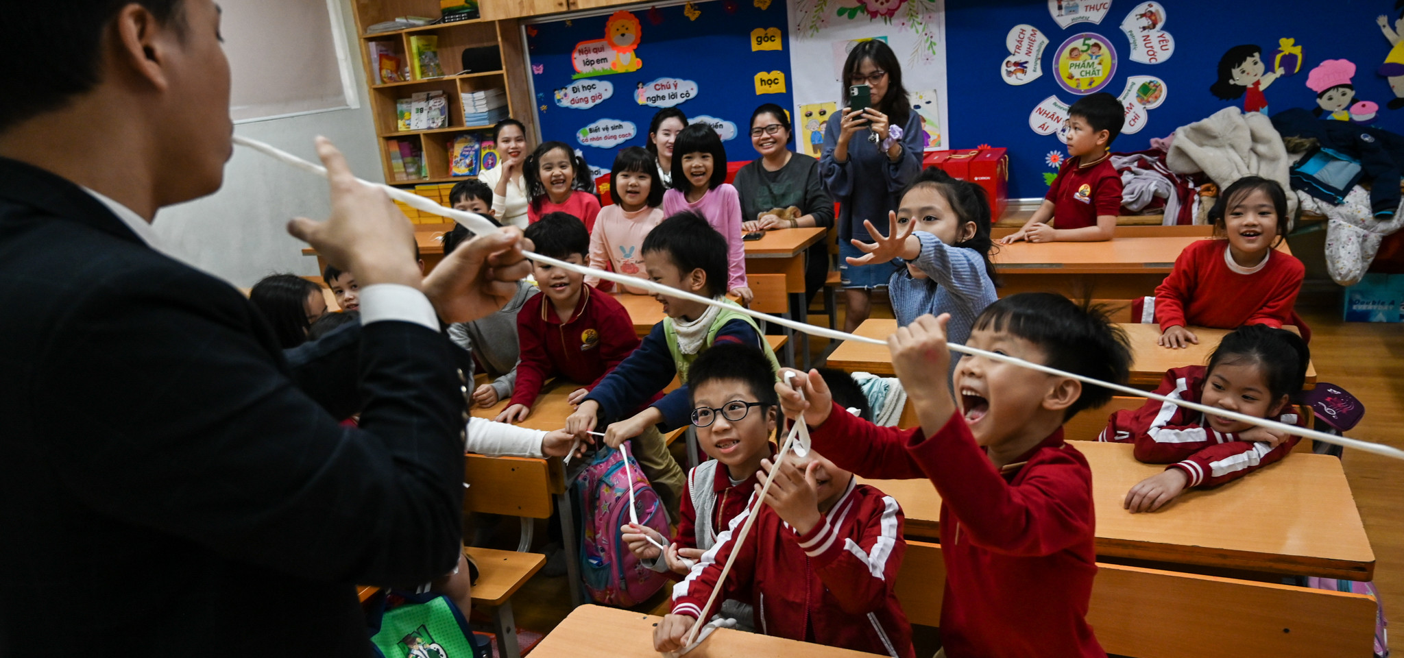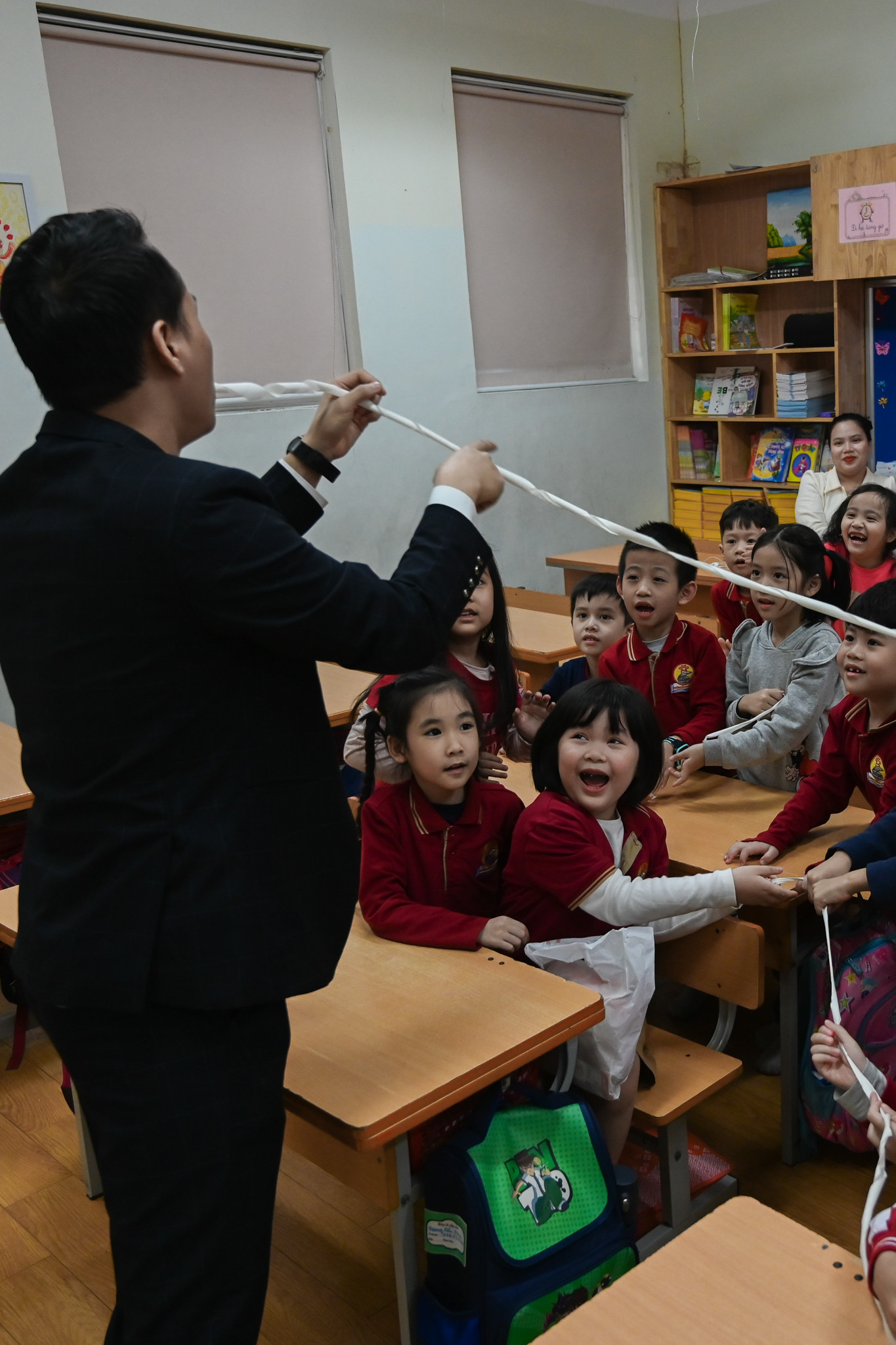 Màn nhả giấy đặc biệt khiến không khí trở nên náo nhiệt. Các bạn nhỏ hào hứng với tay lên kéo sợi giấy ra khỏi miệng nam ảo thuật gia.