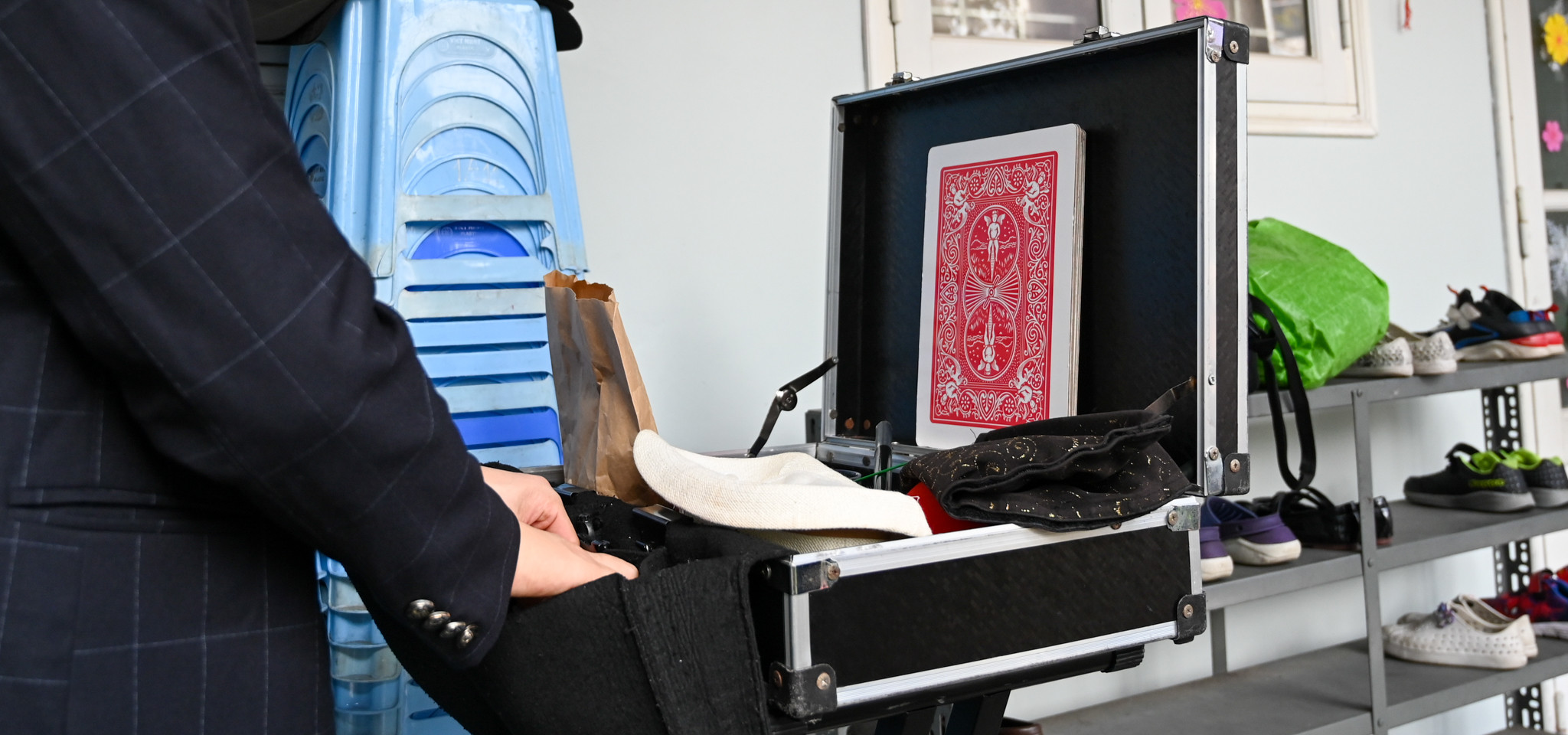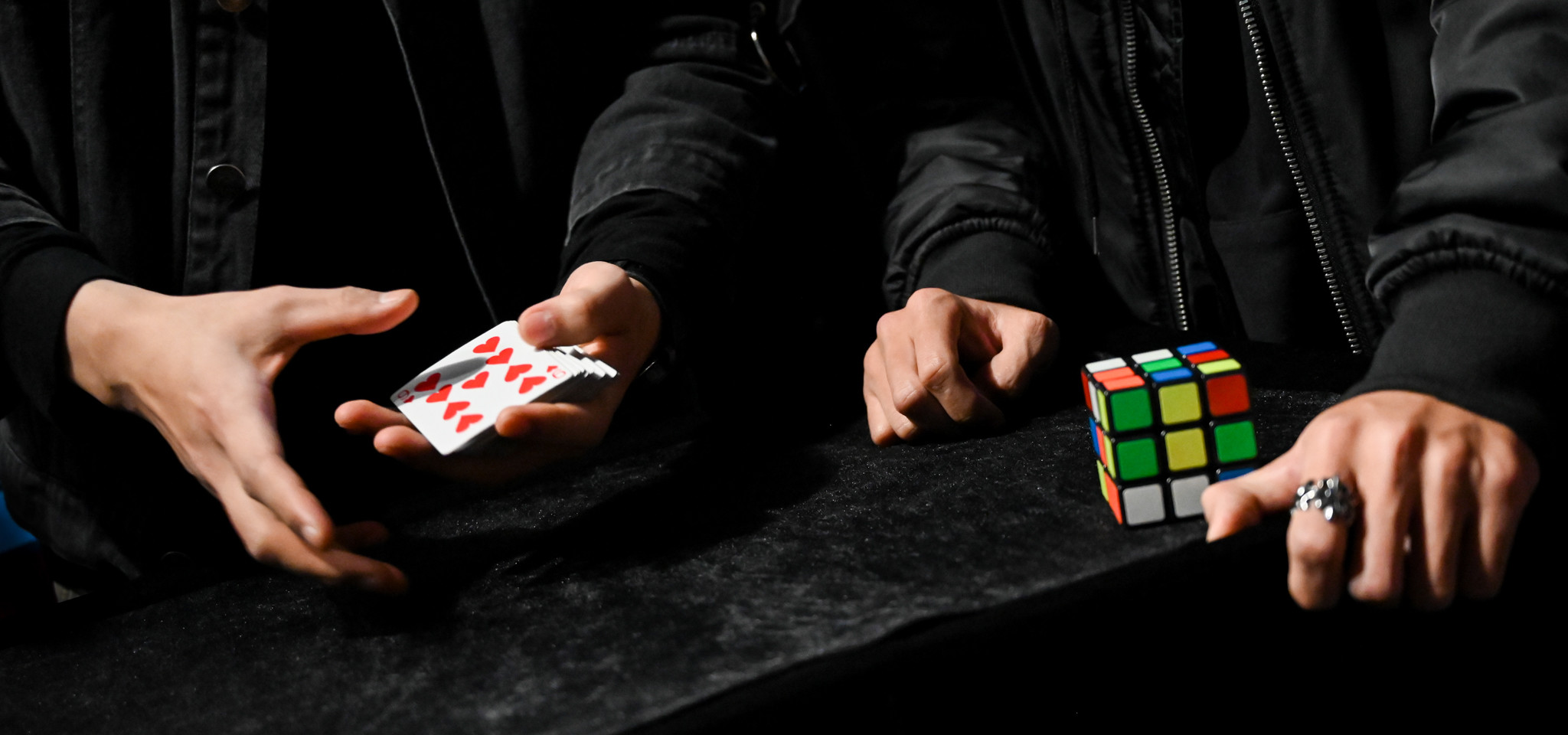 Những đạo cụ hôm nay anh biểu diễn gồm quả bóng ảo thuật, đồng xu, đũa thuần, khối rubik và bộ lá bài tú lơ khơ.