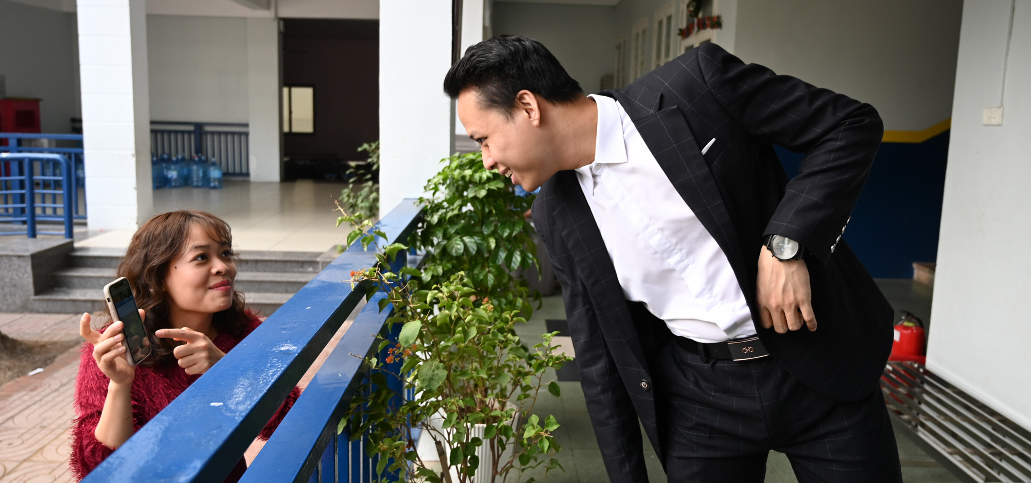 Khi mới bước lên tầng, một giáo viên đã nhận ra anh và mở trang mạng xã hội để xác nhận nam ảo thuật gia điển trai.