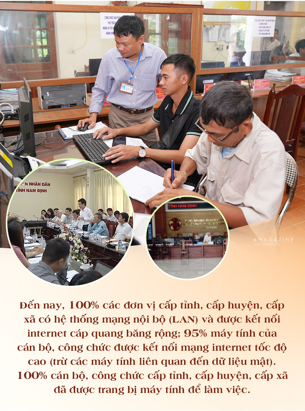 Đến nay, 100% các đơn vị cấp tỉnh, cấp huyện, cấp xã có hệ thống mạng nội bộ (LAN) và được kết nối internet cáp quang băng rộng; 95% máy tính của cán bộ, công chức được kết nối mạng internet tốc độ cao (trừ các máy tính liên quan đến dữ liệu mật). 100% cán bộ, công chức cấp tỉnh, cấp huyện, cấp xã đã được trang bị máy tính để làm việc.