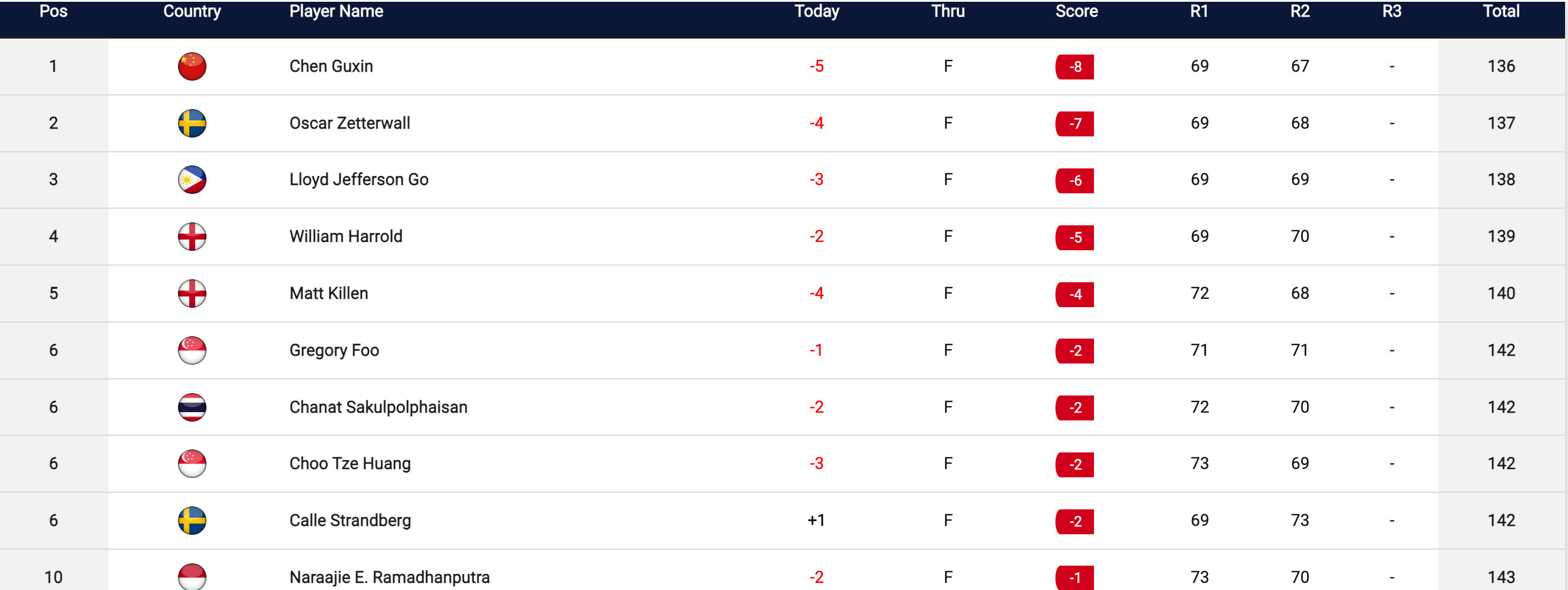 Dẫn đầu BXH sau 2 ngày thi đấu là golfer người Trung Quốc Chen Guxin. Golfer này ghi tới 7 điểm birdie và chỉ mắc 2 bogey, qua đó đạt -5 điểm. Với tổng điểm -8, Chen Guxin có lợi thế nhất định trước khi bước vào ngày thi đấu cuối cùng của giải đấu.