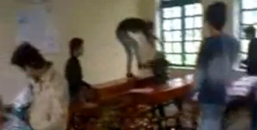 Clip có độ dài hơn 1 phút ghi lại cảnh một nam sinh bị đánh hội đồng ngay trong lớp học. Nạn nhân ngồi yên chịu đựng những cú đạp mạnh thẳng vào đầu, vào mặt, vào lưng của bốn năm nam sinh khác kèm theo những lời chửi rủa tục tĩu. Chưa dừng lại, một học sinh hung hãn còn cầm ghế nhựa giáng thẳng lên đầu của kẻ chịu trận khiến hai chiếc ghế vỡ tan tành.